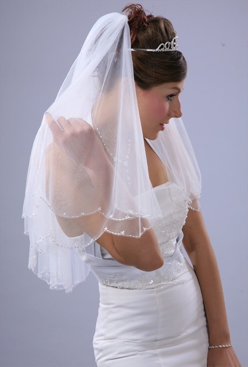 Bridal Veil Ivory 2 Tier Elbow Length Scallop Edge With Silver Lined Seed Beads