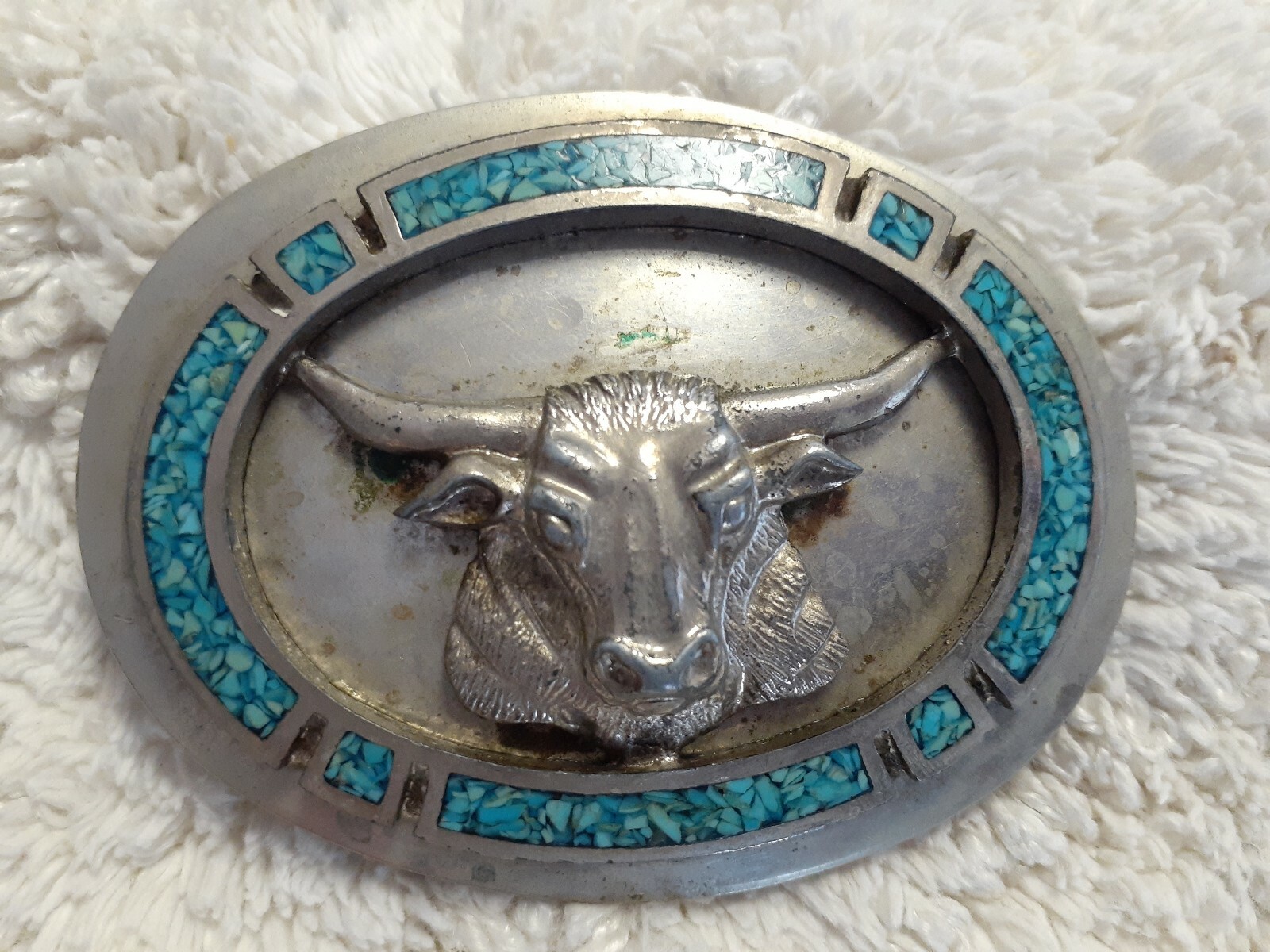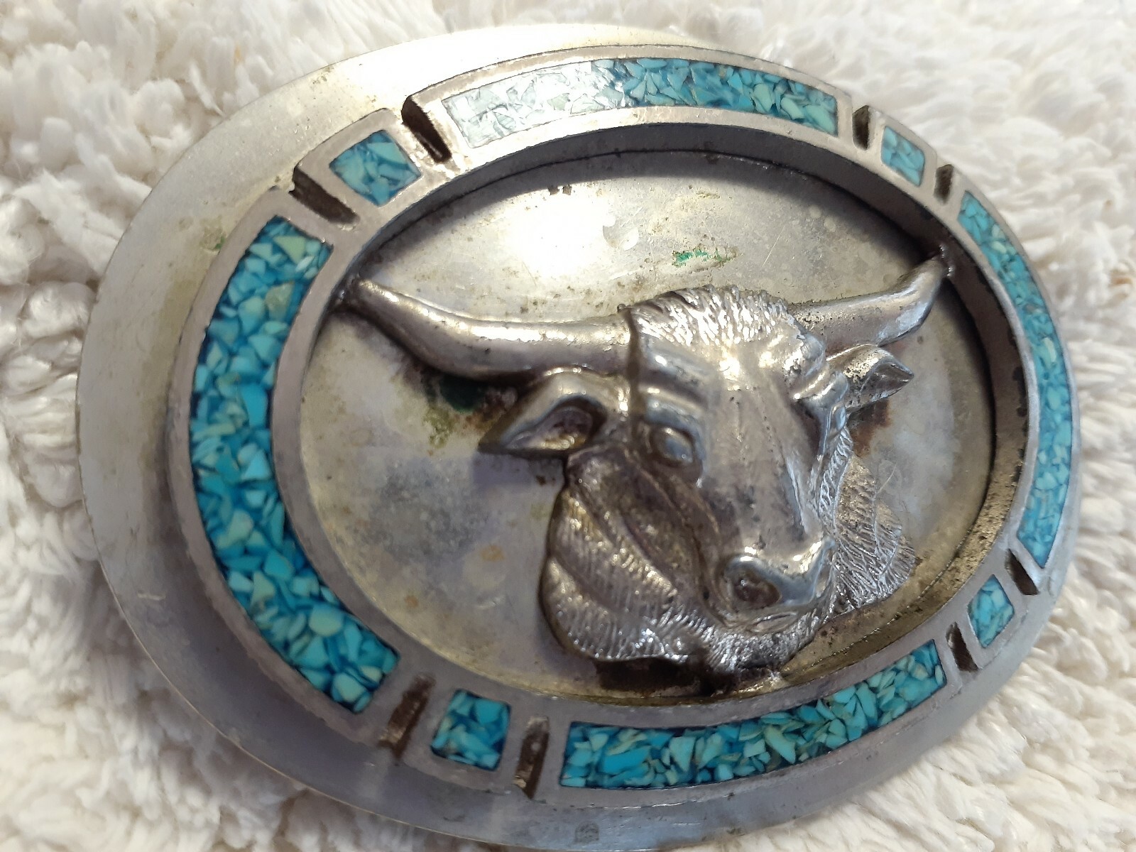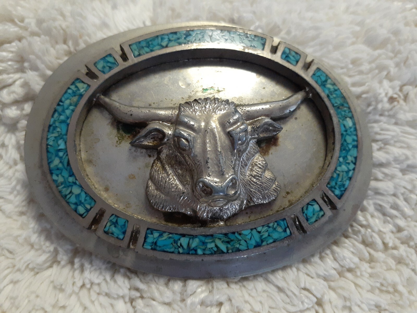 Vtg Silver Tone Bull Head Horns Turquoise Inlay Belt Buckle Unmarked