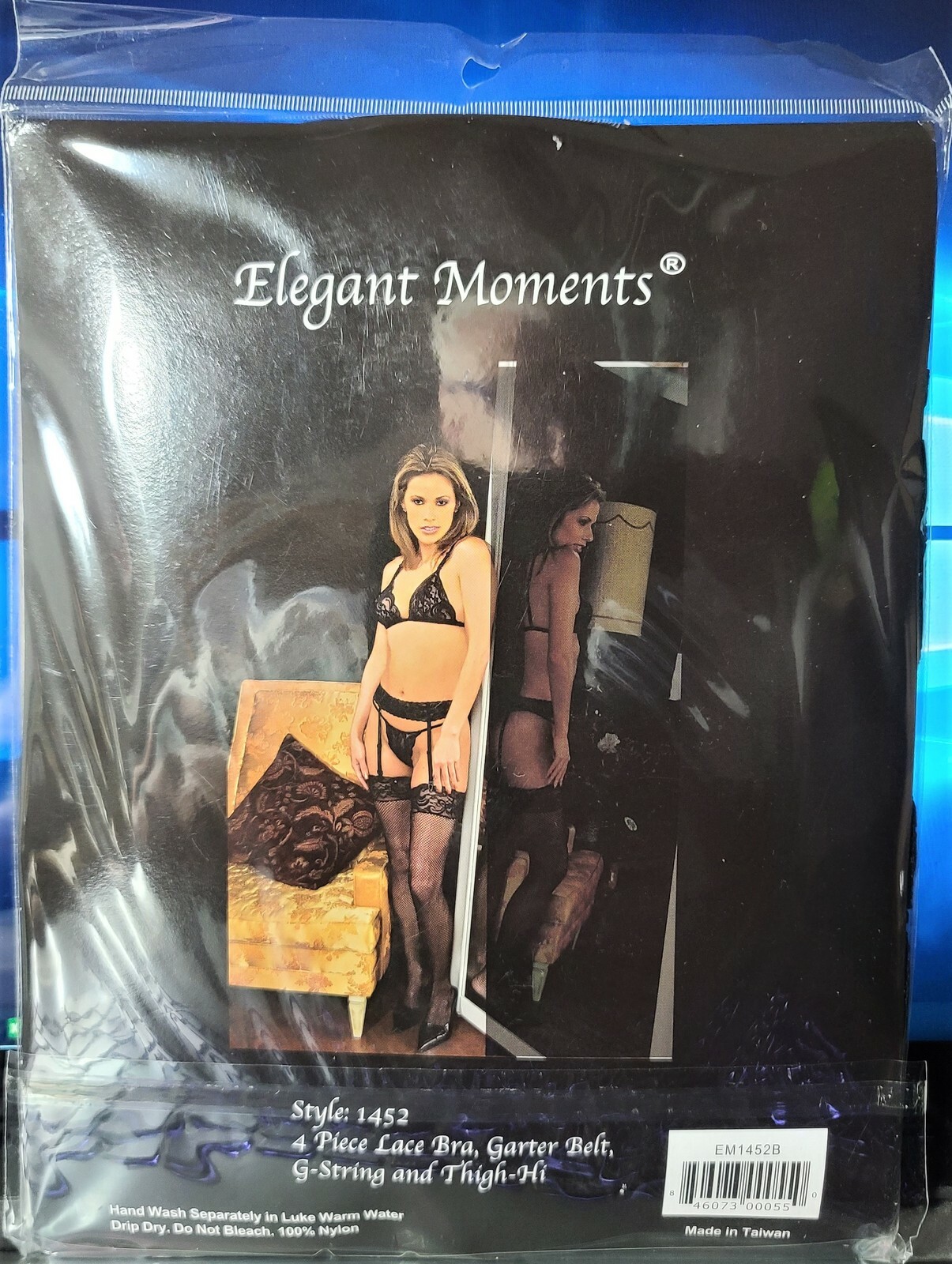 Elegant Moments Style 1452 Black 4 Pc Lace Bra, Garter, Belt, G-String Thigh-H