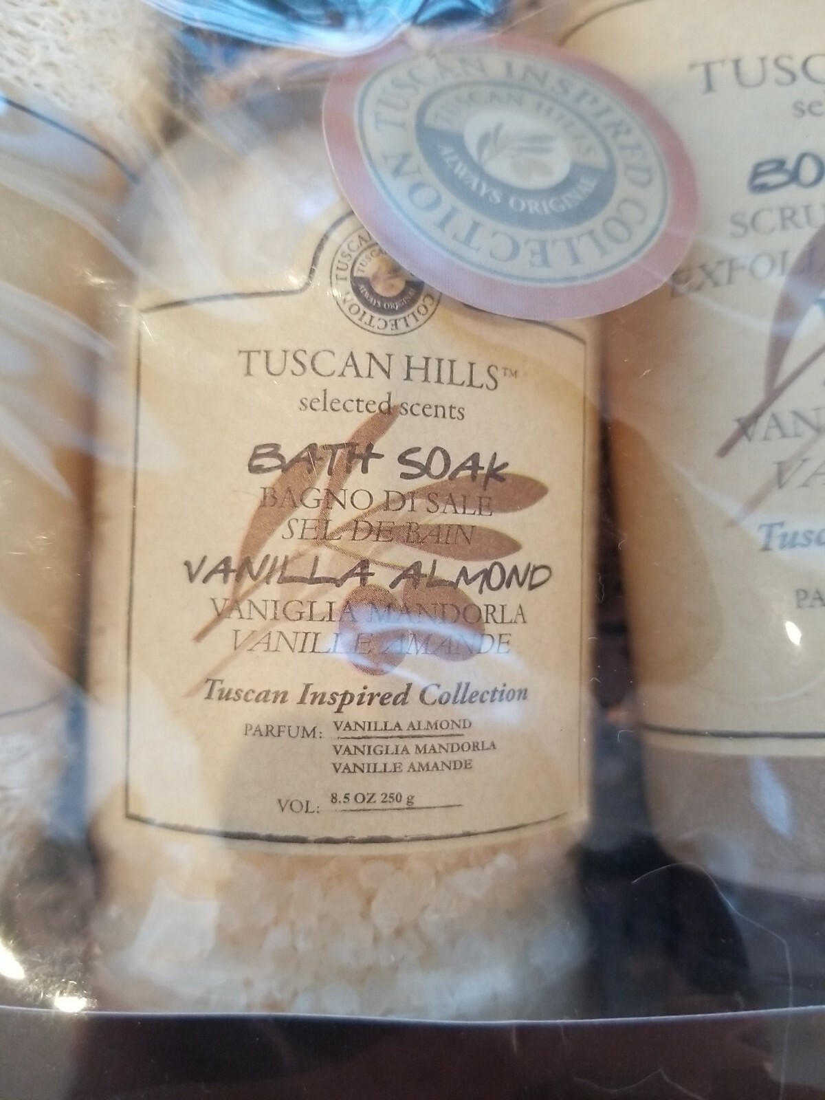 Tuscan Hills Vanilla Almond Bath Gift Set Loofah Sponge Salt Body Scrub Lotion