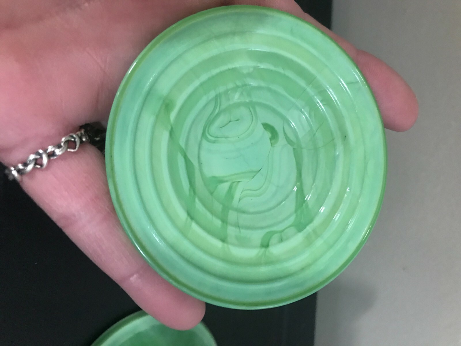 как выглядит Vintage Jadeite Childs Tea Plates Green White Swirls Milk Glass AKRO Agate фото