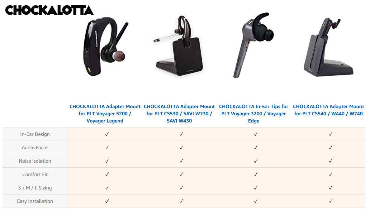 CHOCKALOTTA In-Ear Adapter for Plantronics CS530 / W730 / W430 Headsets