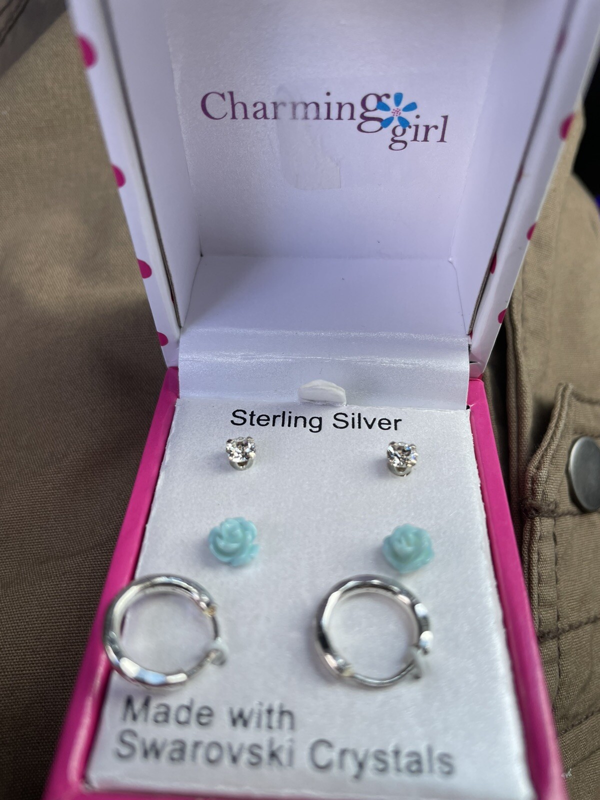 NIB Charming Girl Sterling Silver Swarovski Crystal stud set Of 3 earrings