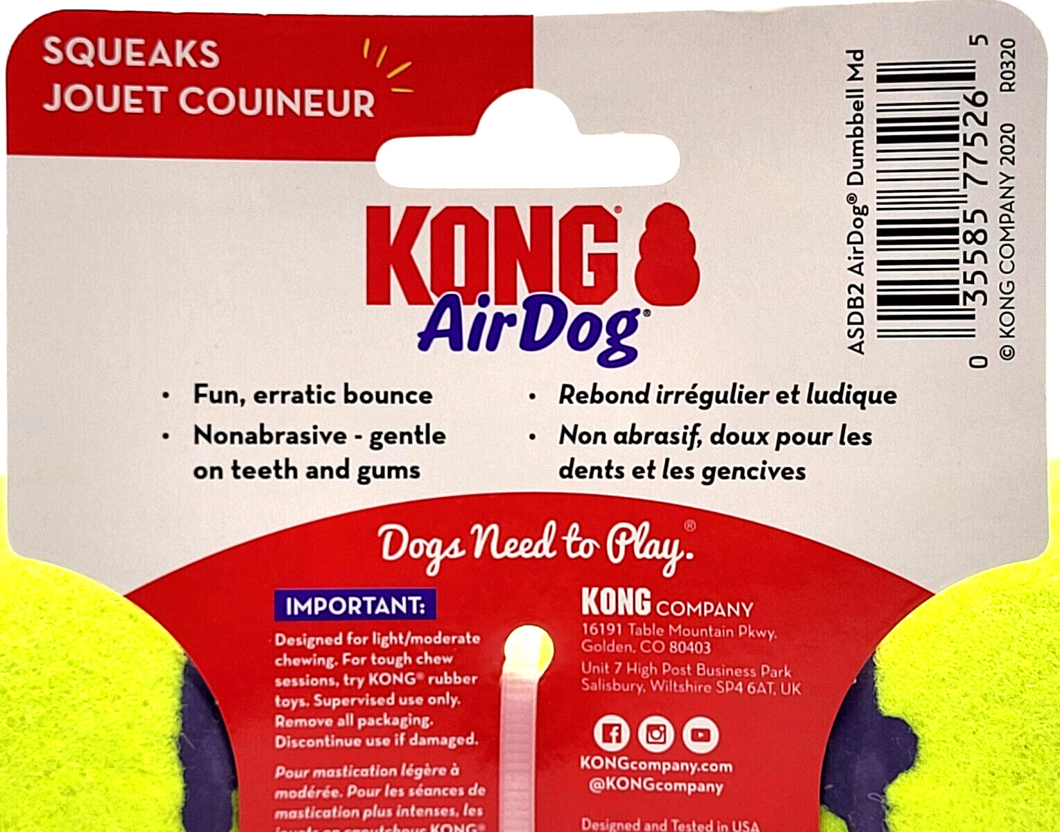 KONG AirDog Dumbbell Tennis Ball Medium Interactive Squeaky Dog Fetch Toy