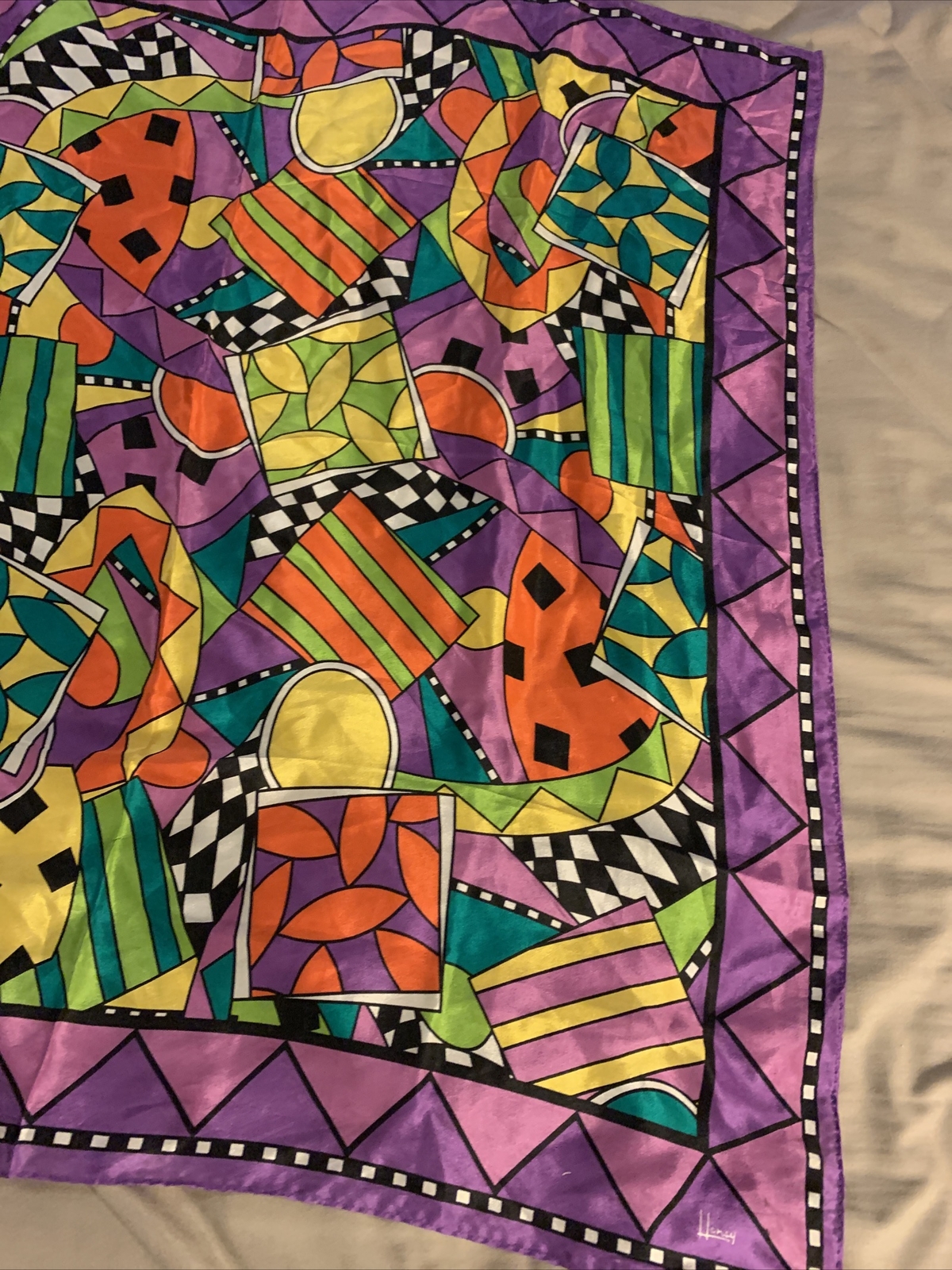 VINTAGE SIGNED HONEY 100 ABSTRACT PURPLE RETRO PSYCHEDELIC MULTI SCARF 31
