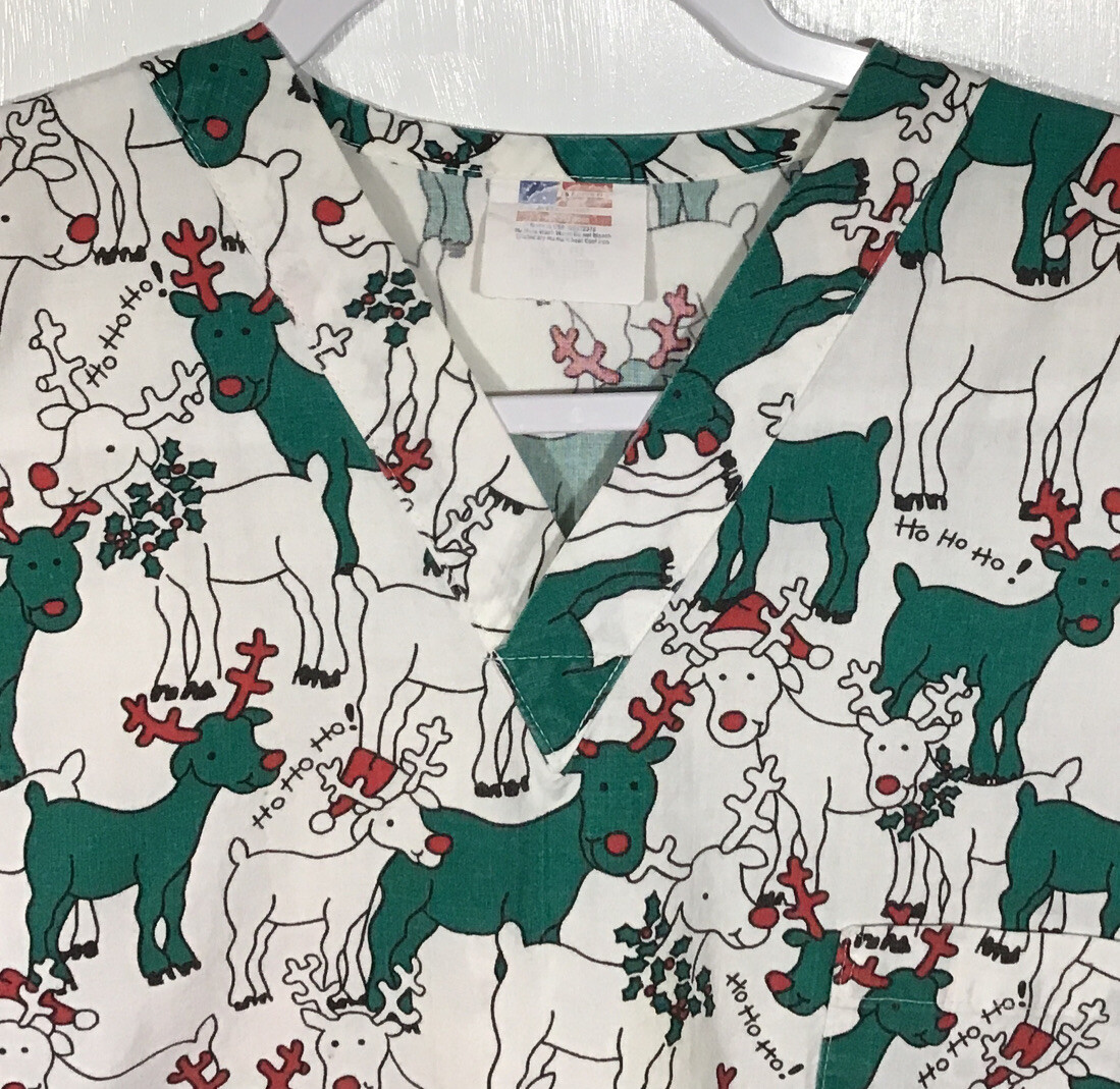 как выглядит Christmas Scrub Top womens size S Small Holiday Reindeer Santa Hats Holly Green фото