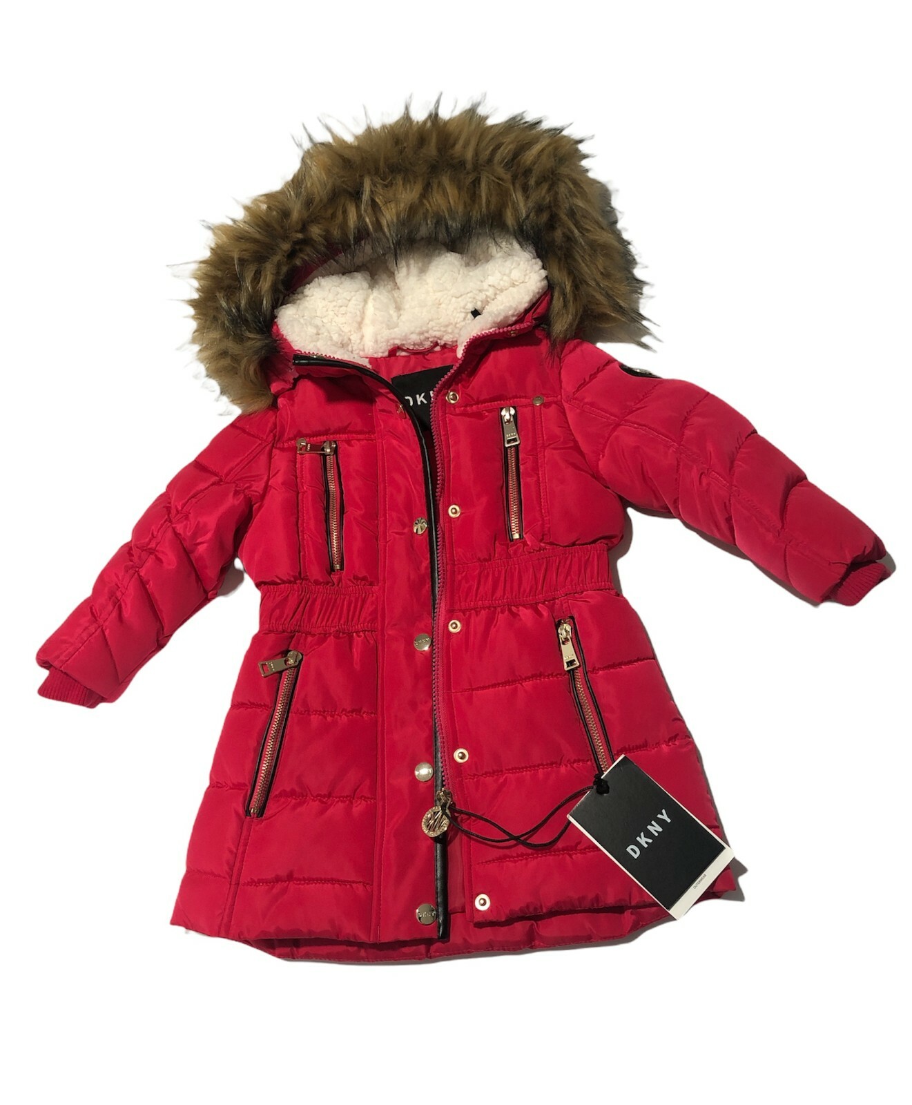 DKNY Toddler Girls Hooded Puffer Jacket with Faux-Fur Trim fuchsia/natural 2T