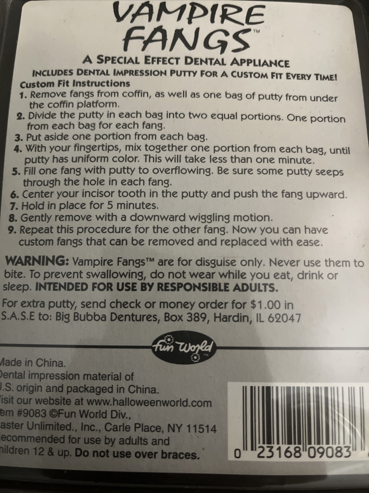 Brand New Still In Package High Quality Vampire Fangs Set Of One