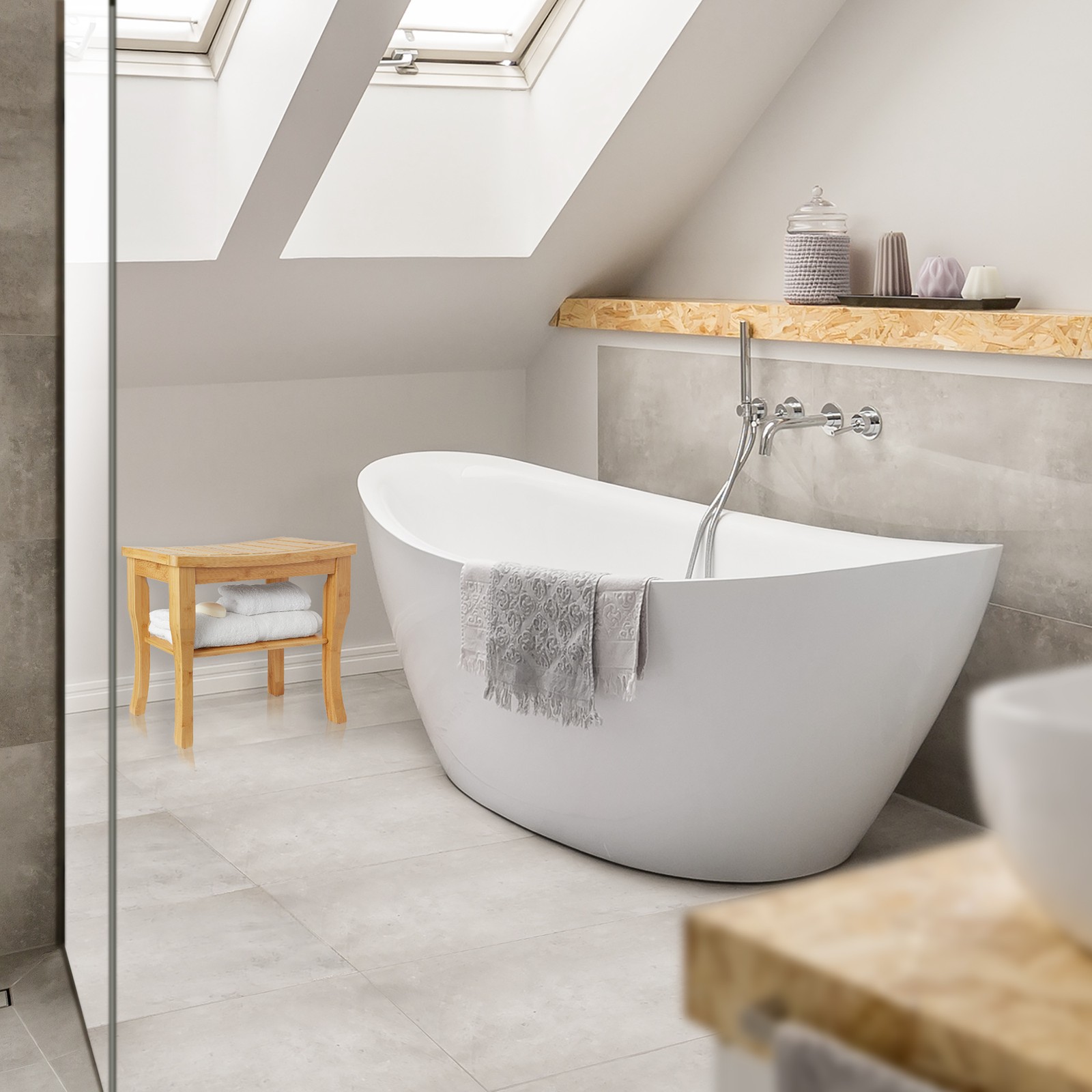 как выглядит Bamboo Shower Bench with Storage Shelf, Wood Bathroom Spa Stool Seat for Bathtub фото