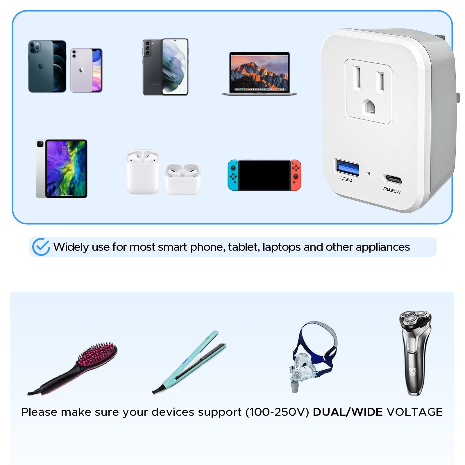 Особенности: Fold-In Plug, Indicator Light, Power Indicator Light, USB Charger, USB Port
