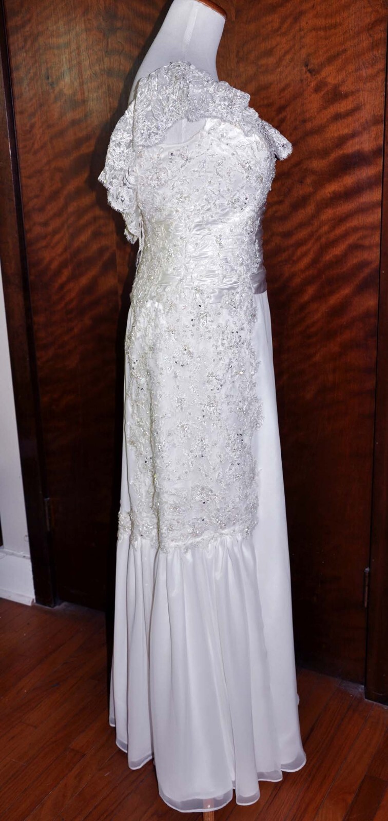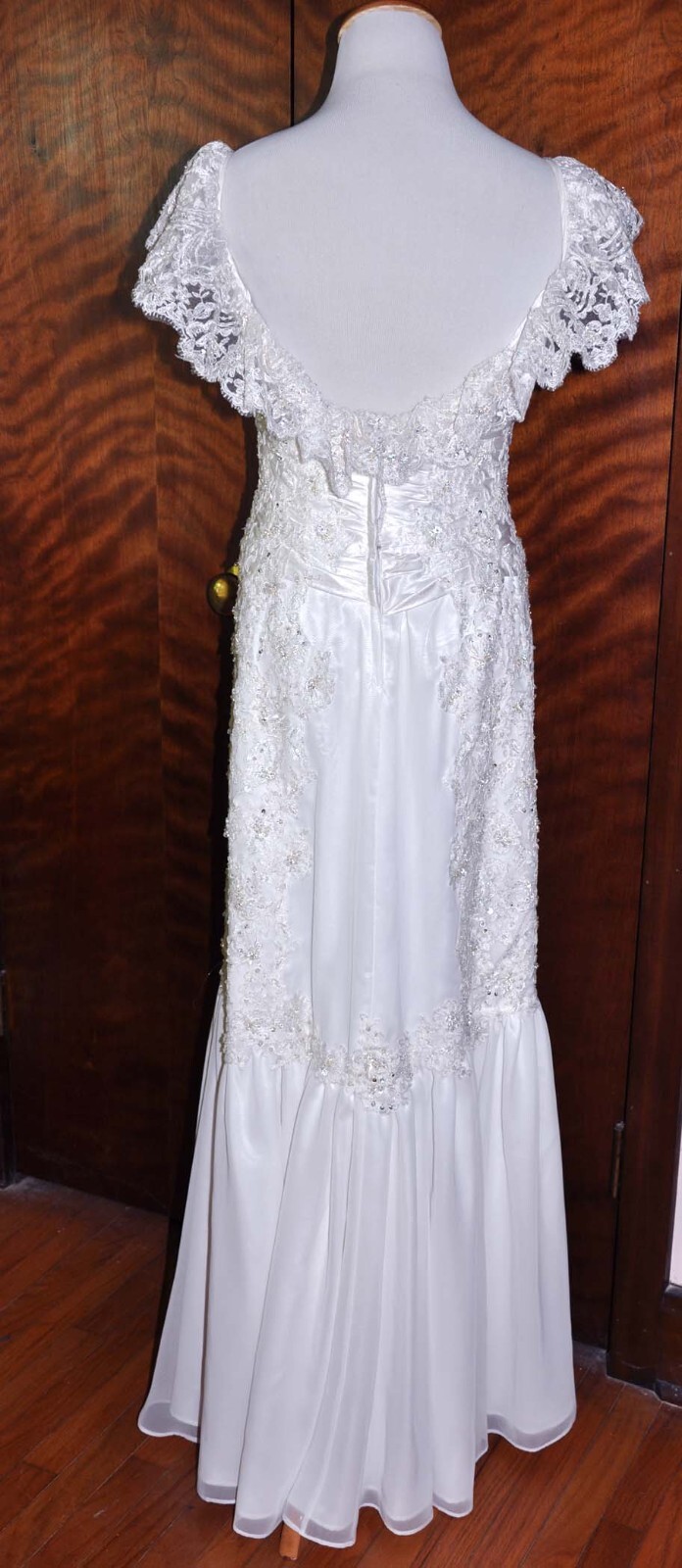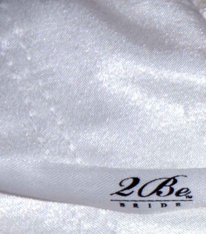White 2 Be Bride Beaded Satin Applique Lace Cap Sleeve Wedding Bridal Gown