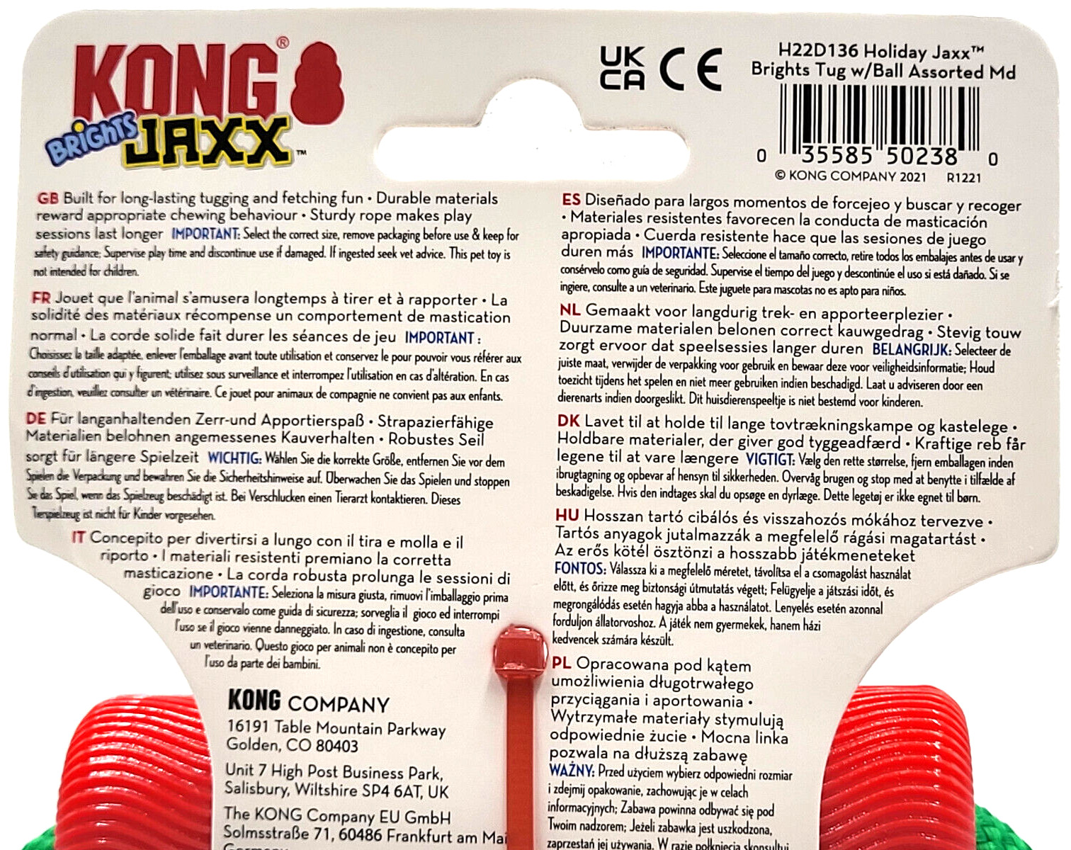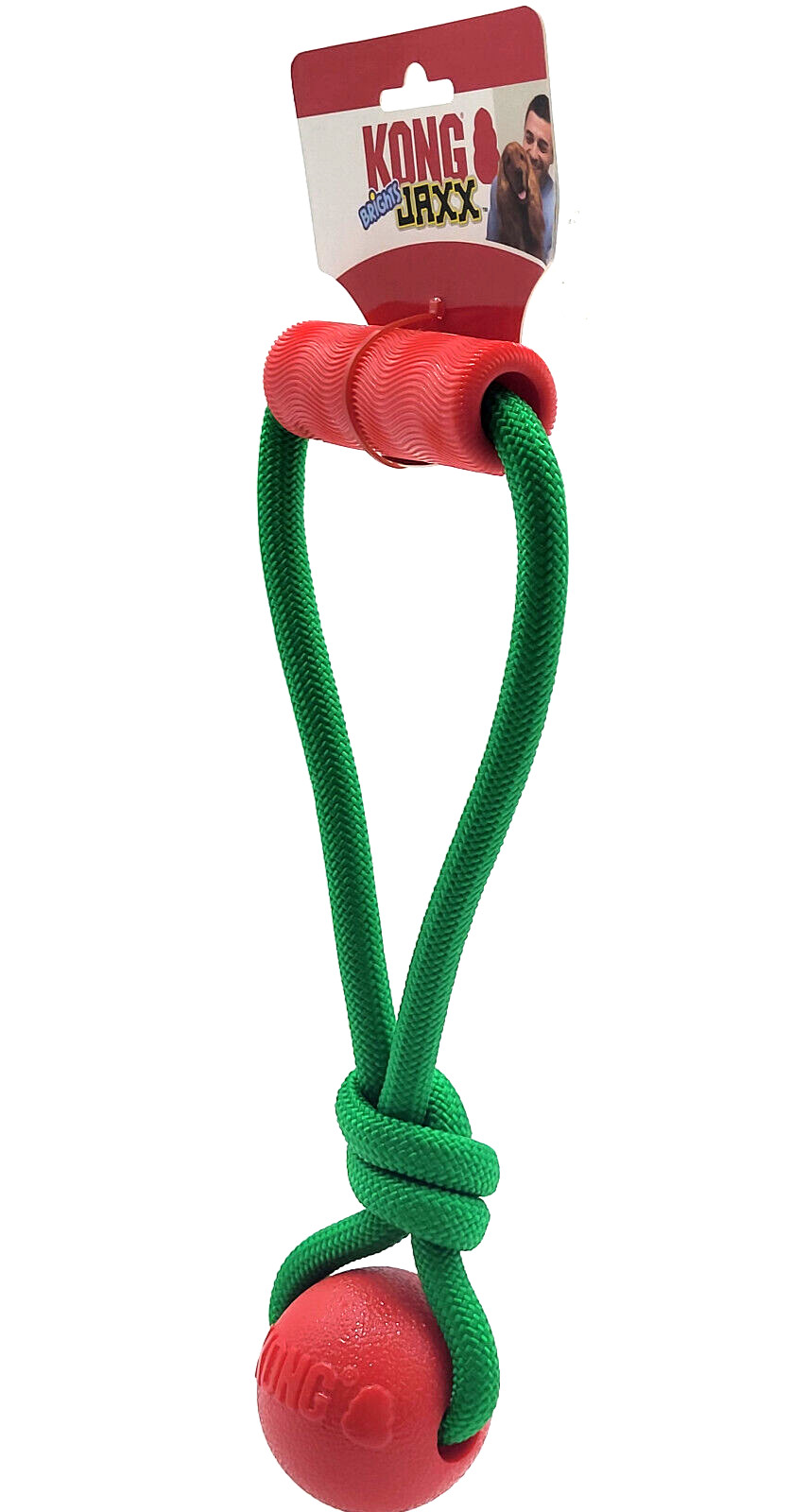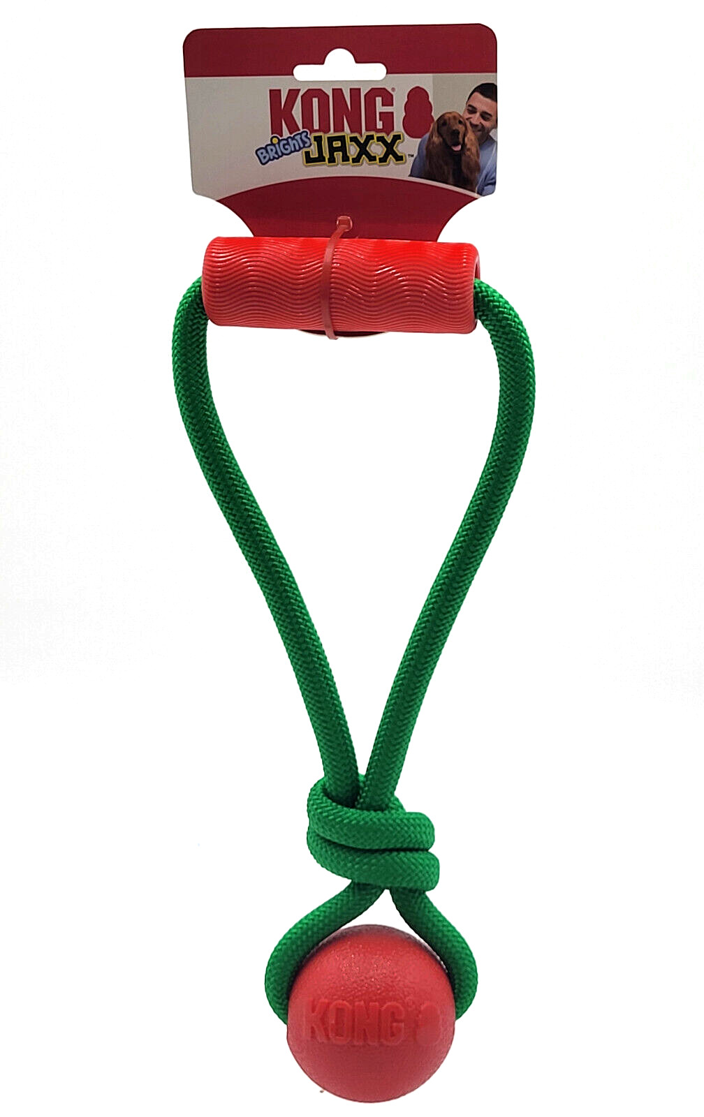 KONG Holiday Christmas Jaxx Brights Ball w/Rope Medium Red Green Tug Dog Toy
