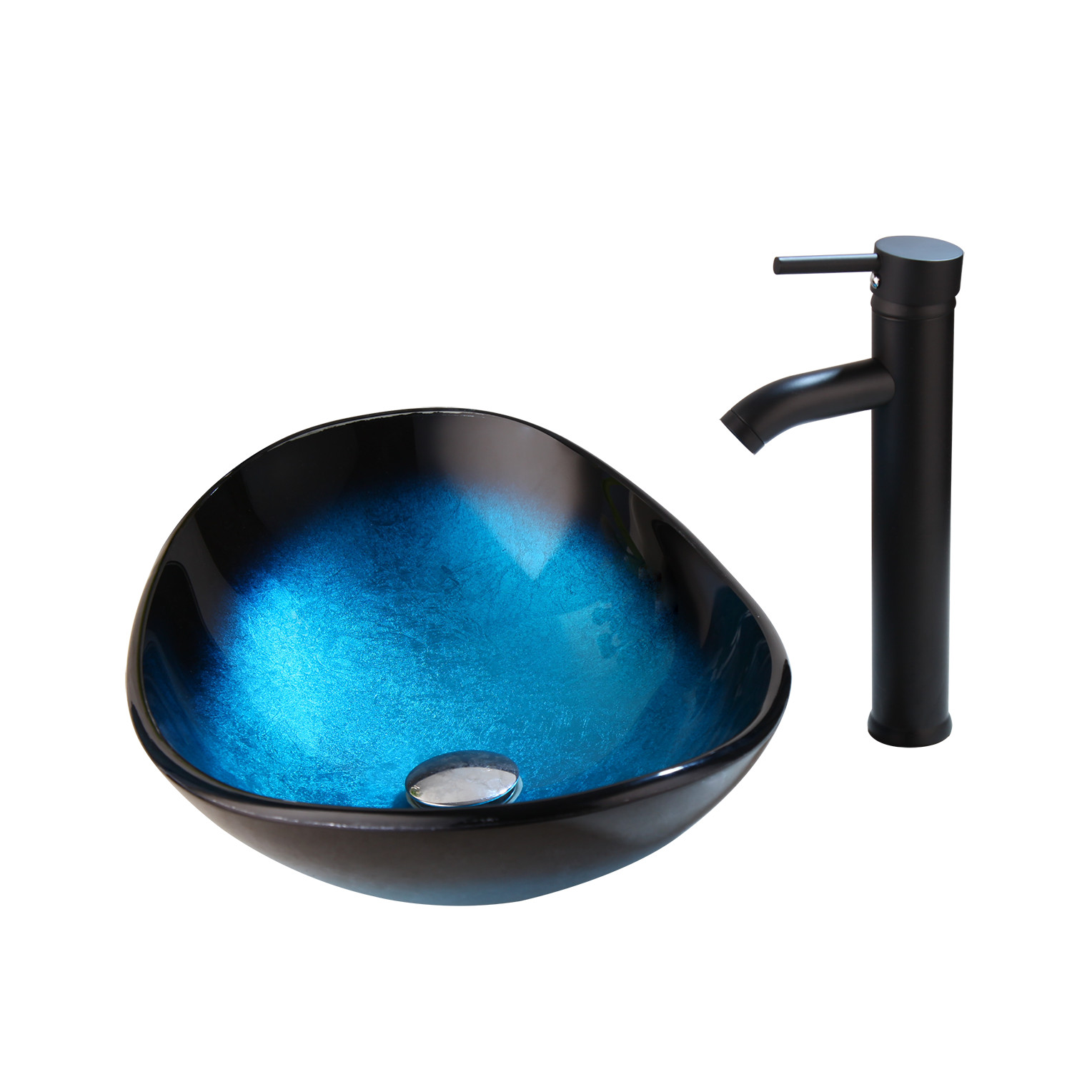 Artistic Blue Bathroom Oval Glass Vessel Sinks Basin Bowl Black Faucet Drain Set