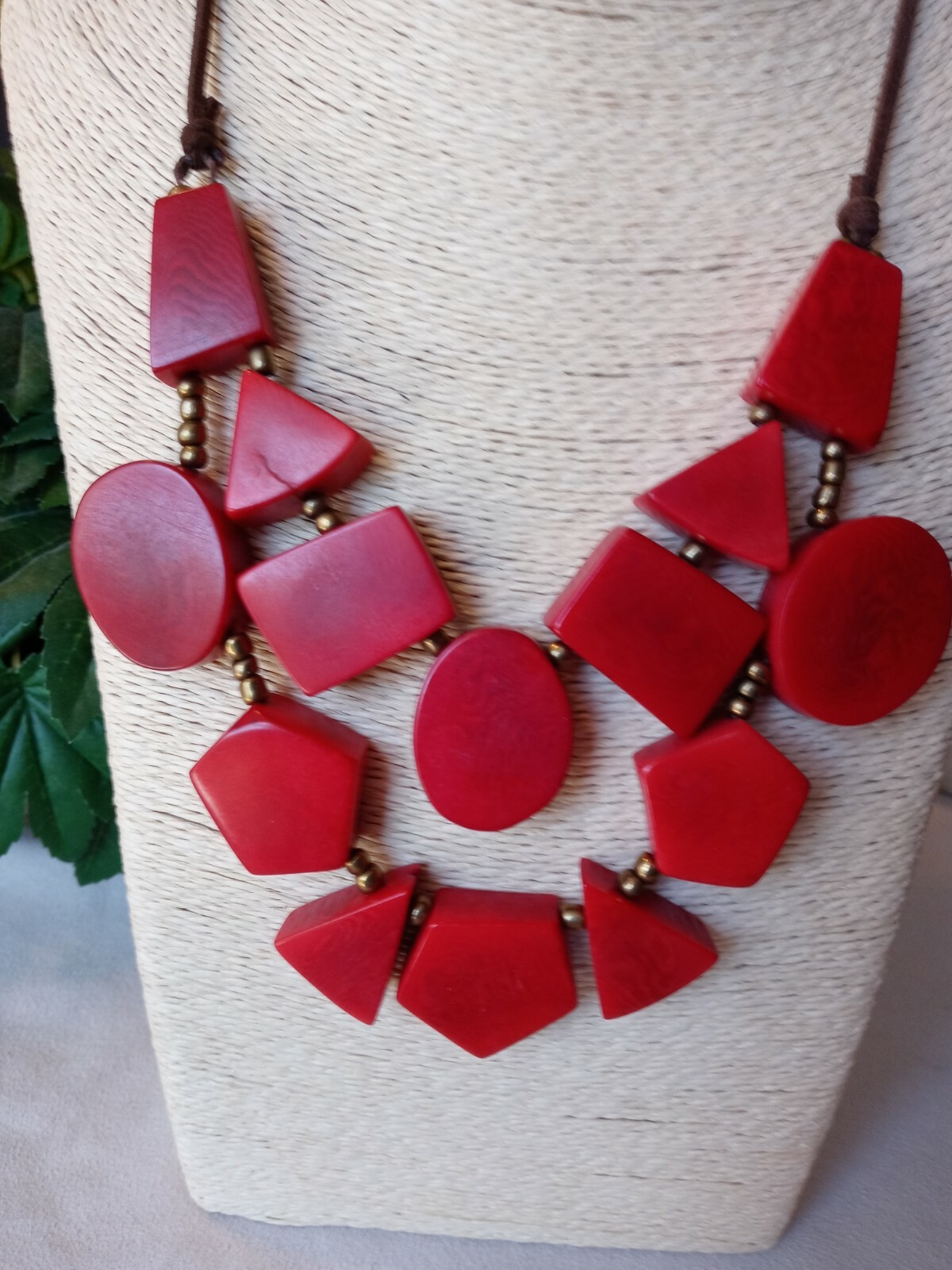 Handcrafted Tagua Nut Organic Necklace, boutique, 2 Strands, Red, ECUADOR