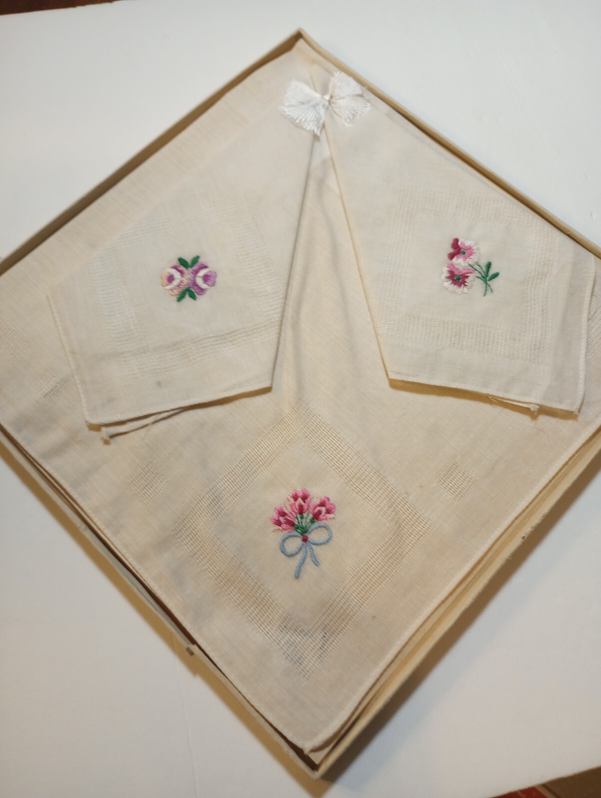как выглядит VINTAGE GIFT BOXED SET OF 3 EMBOIDERED FLOWERS LINEN HANKIES 43-B1001 фото