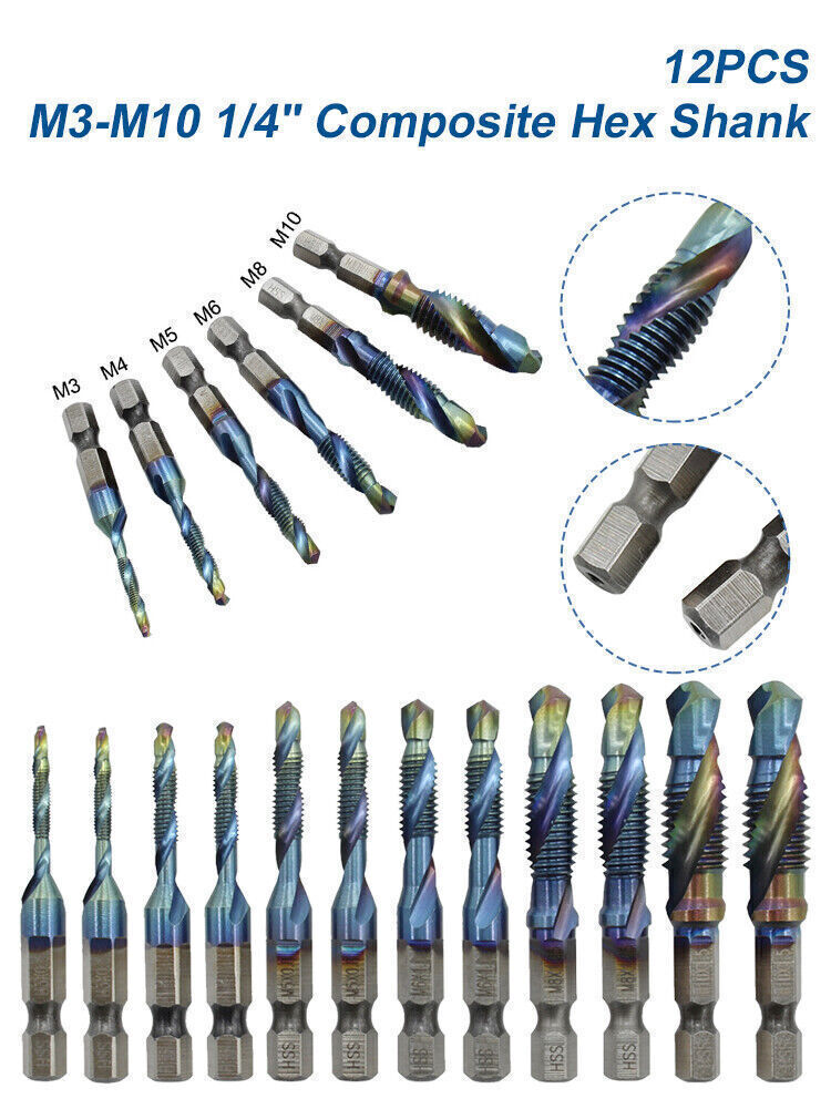 12PCS M3-M10 1/4 Hex Shank Composite HSS Metric Screw Thread Tap Drill Bits Set