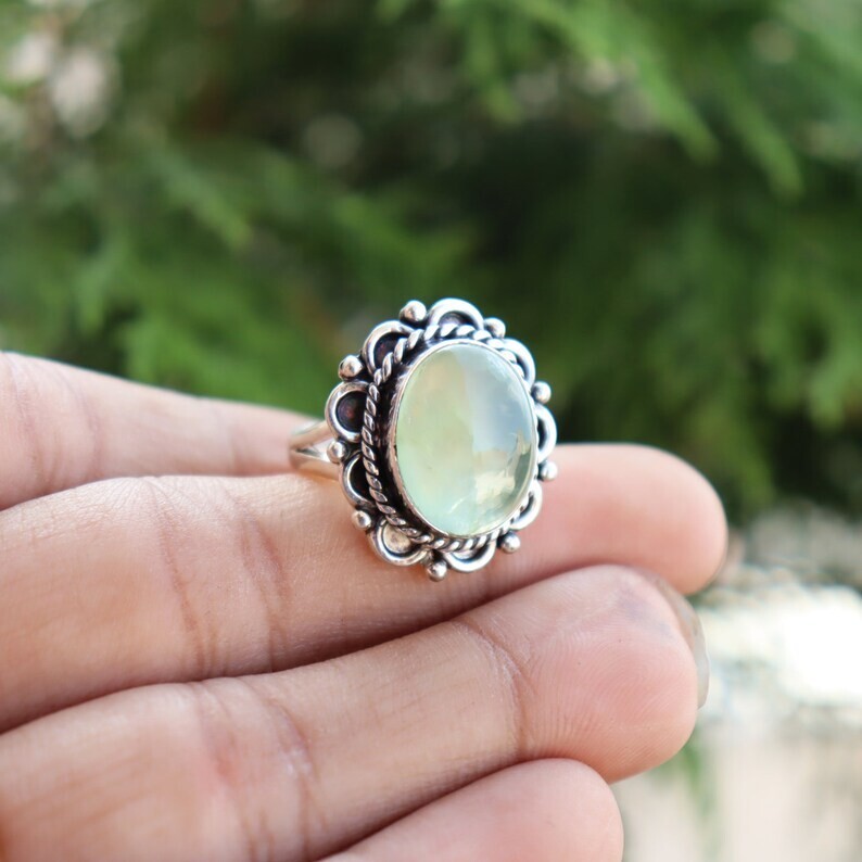 925 Sterling Silver Natural Prehnite Oval Gemstone Ring Boho Ring Handmade Ring