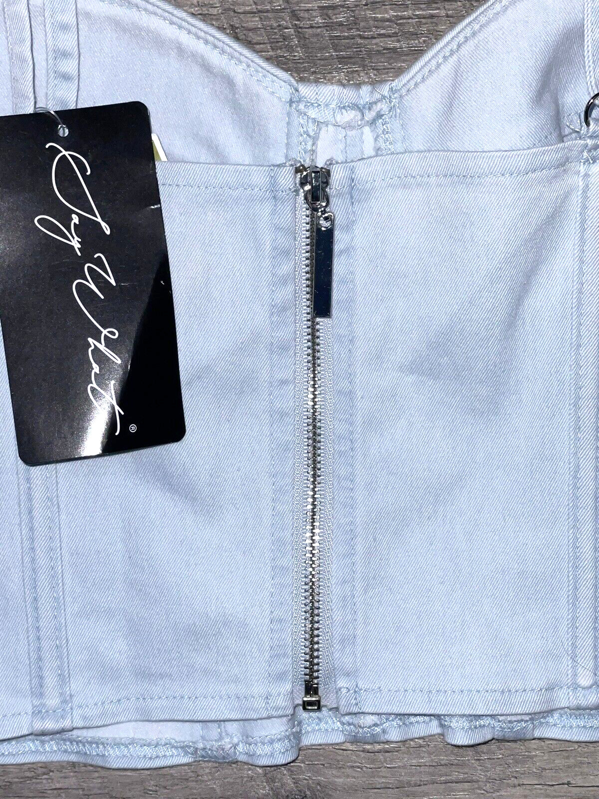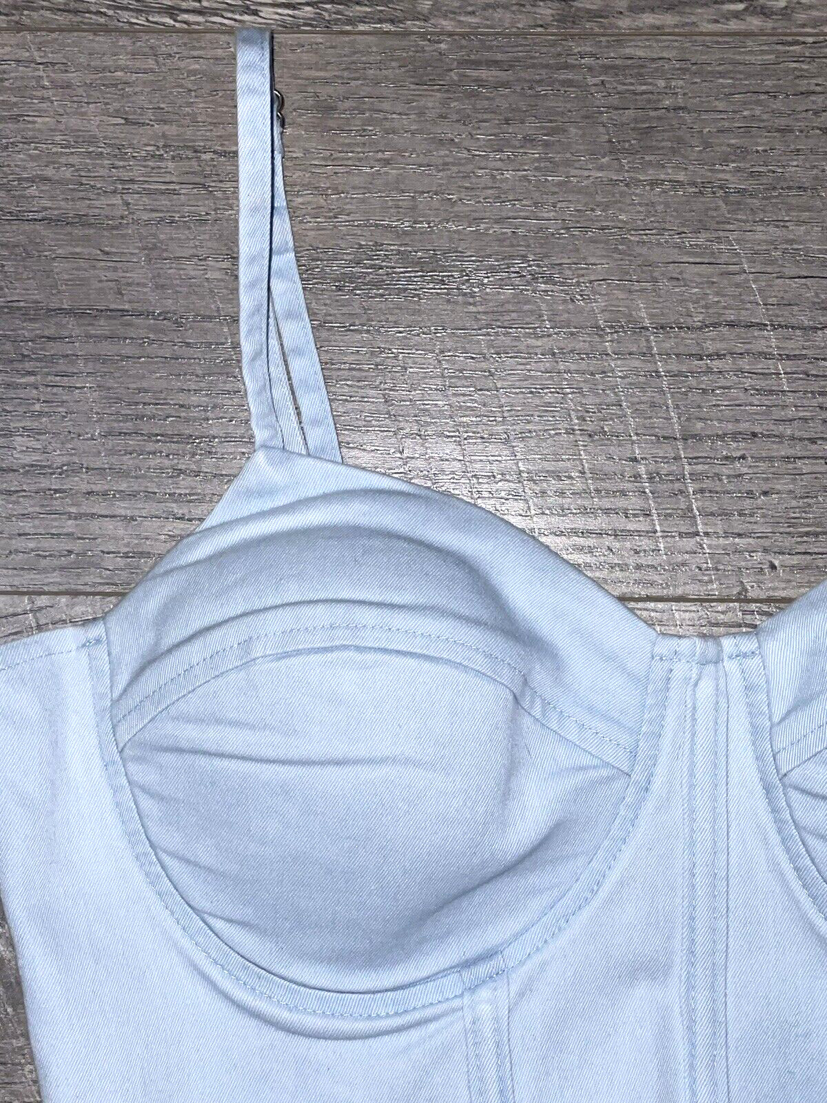 как выглядит NWT Women M SAY WHAT Light Washed Denim Padded Cropped BUSTIER Top Adj Straps фото