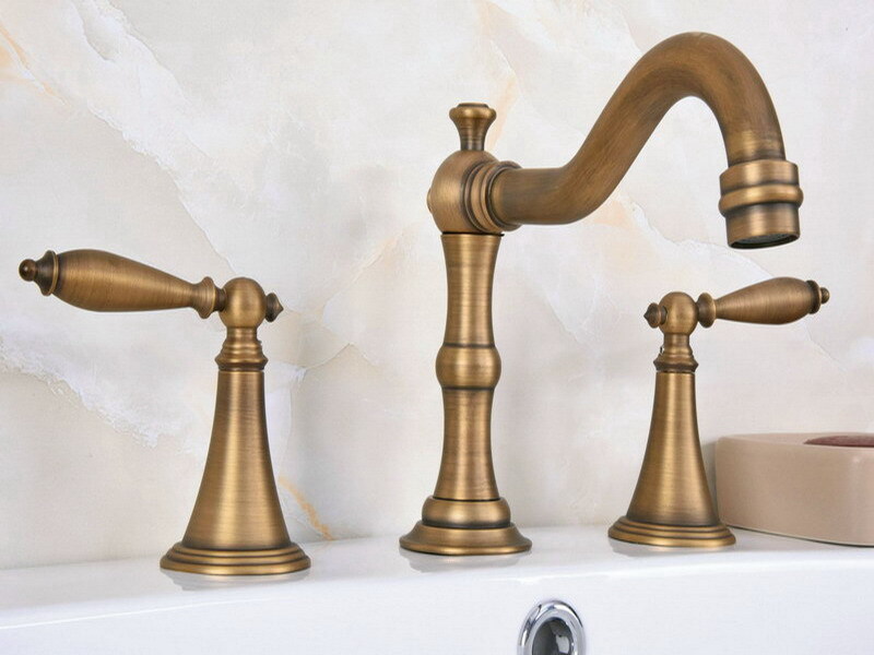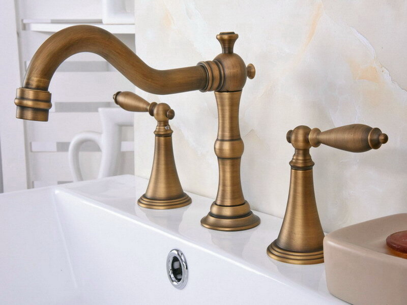 как выглядит Antique Brass Deck Mounted Widespread Bathroom 3 Holes Faucet Water Taps fan087 фото