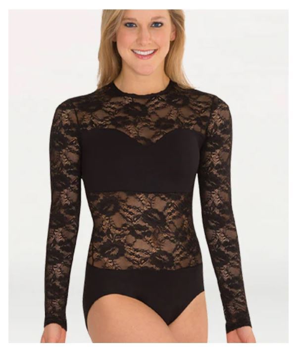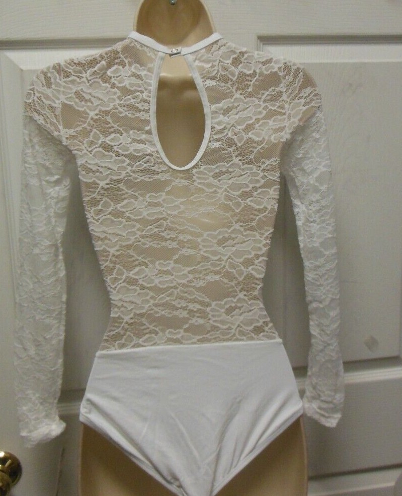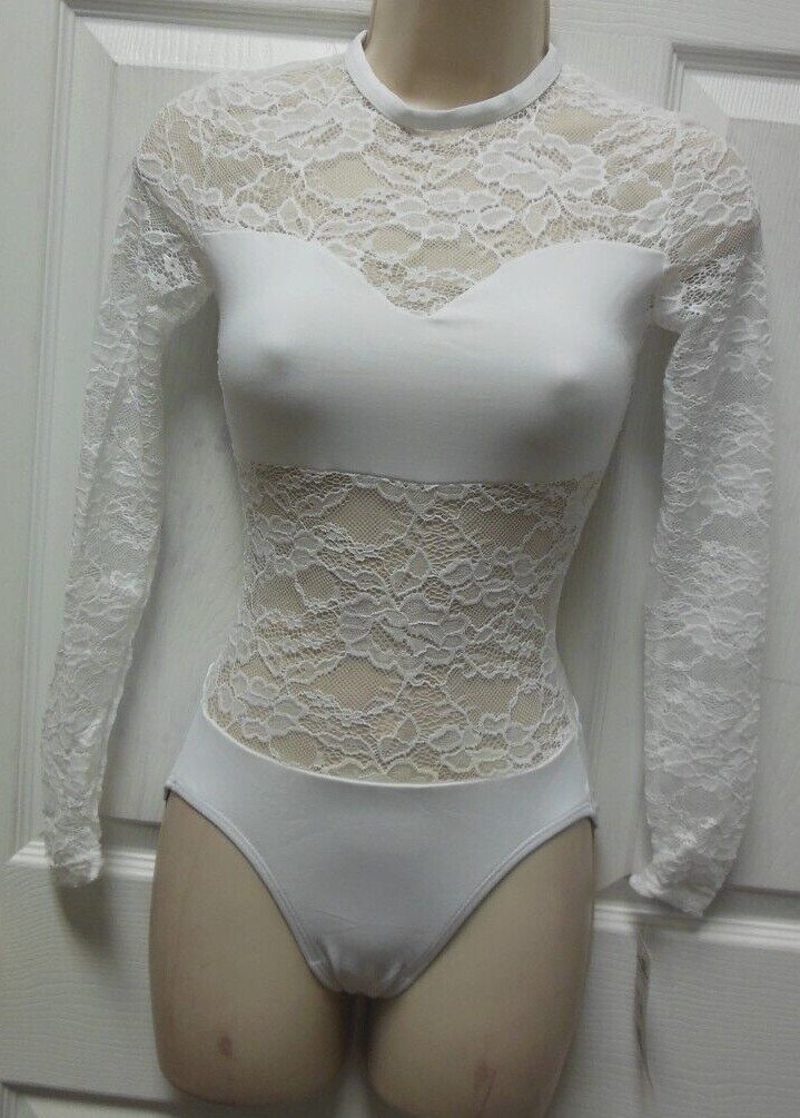 Body Wrappers LC210 White Lace Sheer midriff long sleeve leotard Ladies Sizes