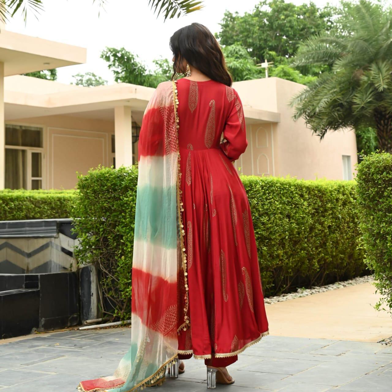 Women Flared Anarkali Kurta Pant With Designer Dupatta Set Bollywood Wear Dress