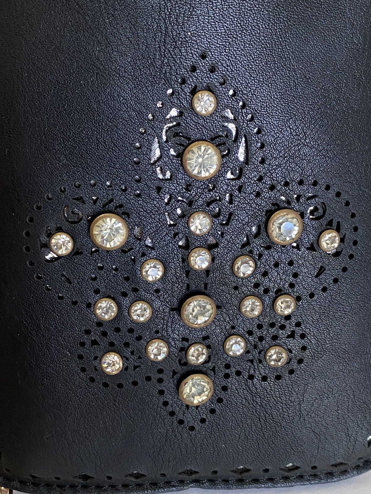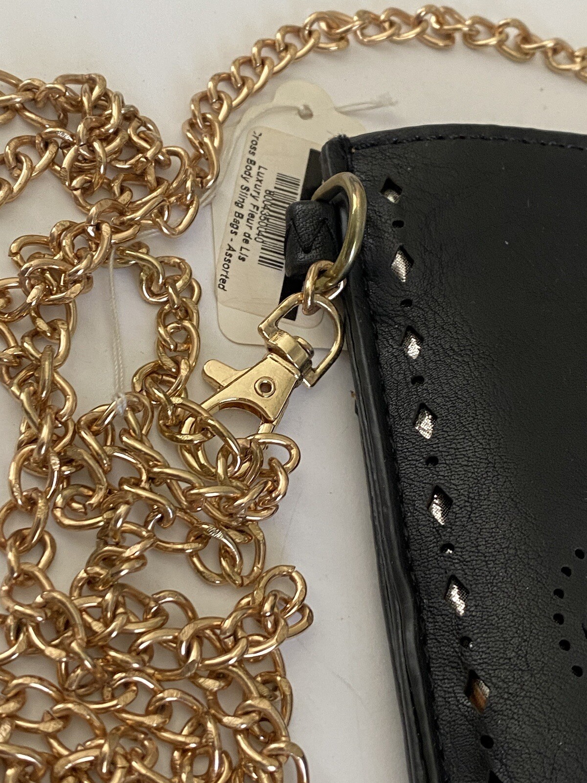 как выглядит Genuine Black Leather Rhinestone Crossbody Phone Purse Gold Chain Strap NWT фото
