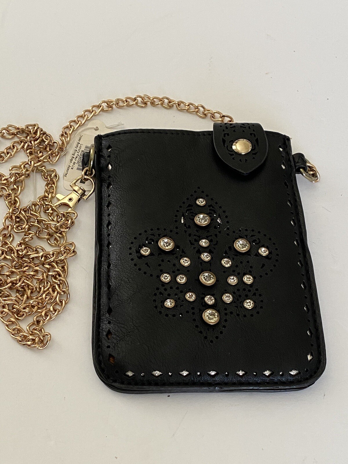 Genuine Black Leather Rhinestone Crossbody Phone Purse Gold Chain Strap NWT