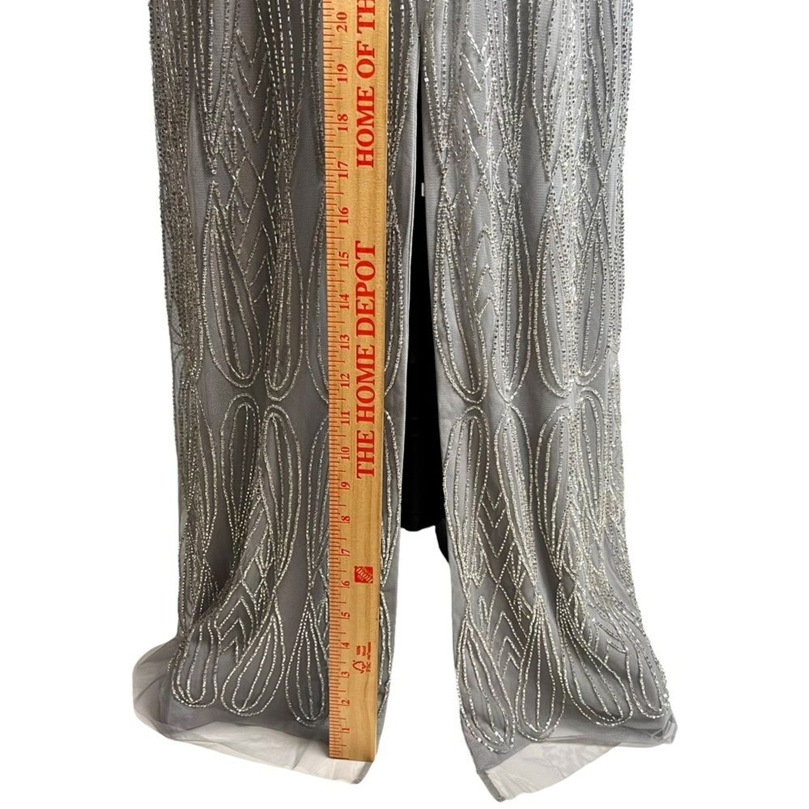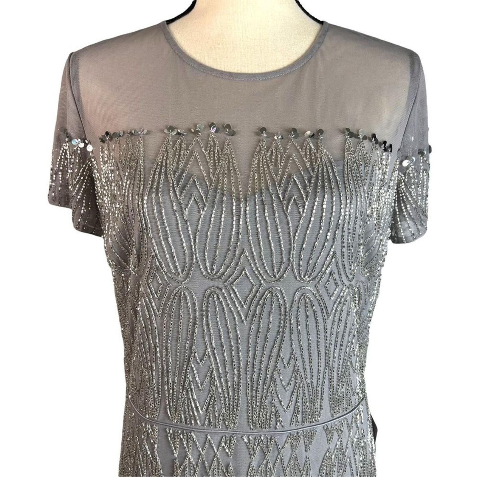 как выглядит JS Collections Illusion Yoke Beaded Column Gown Dress Silver / Grey plus Formal фото