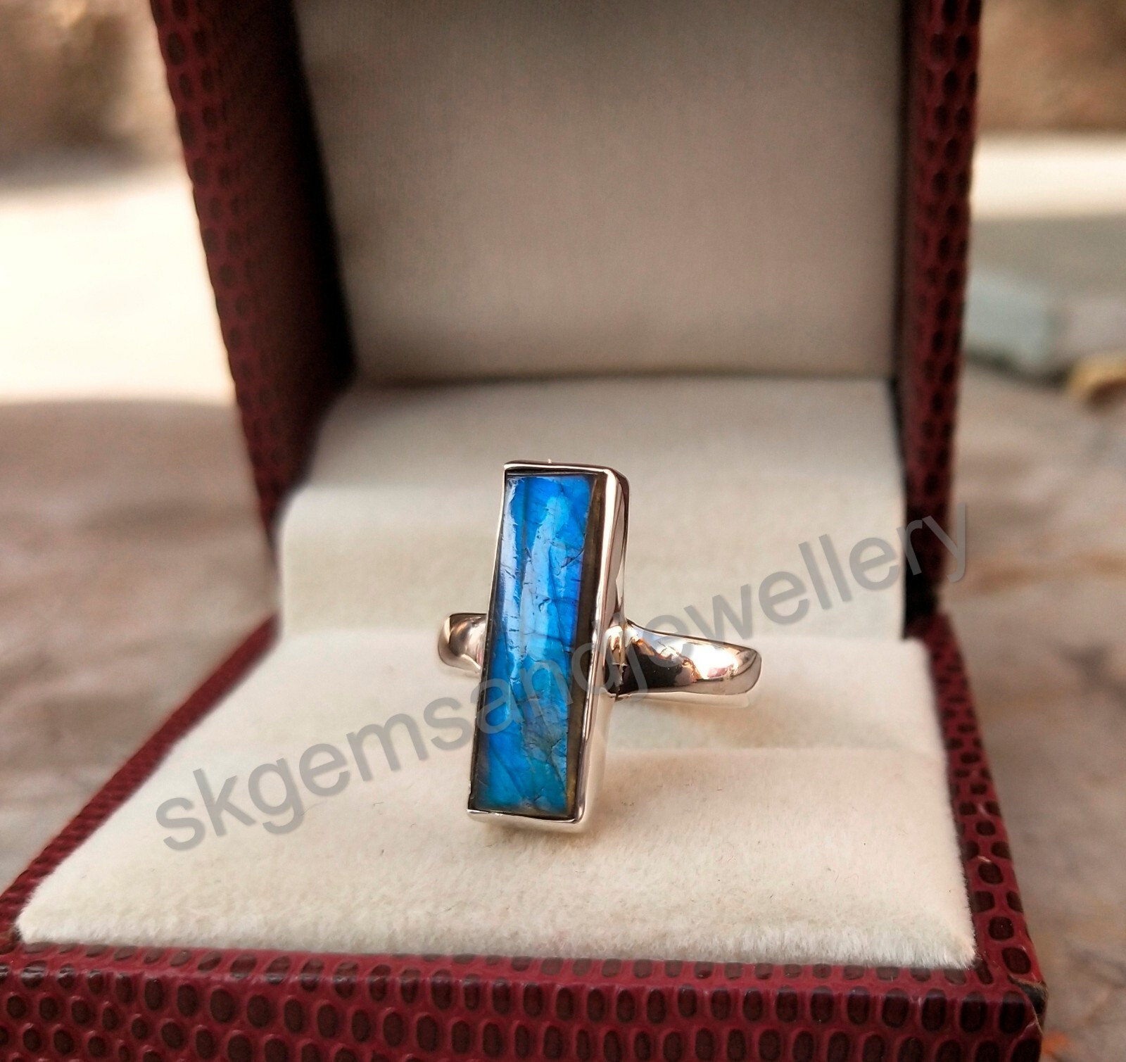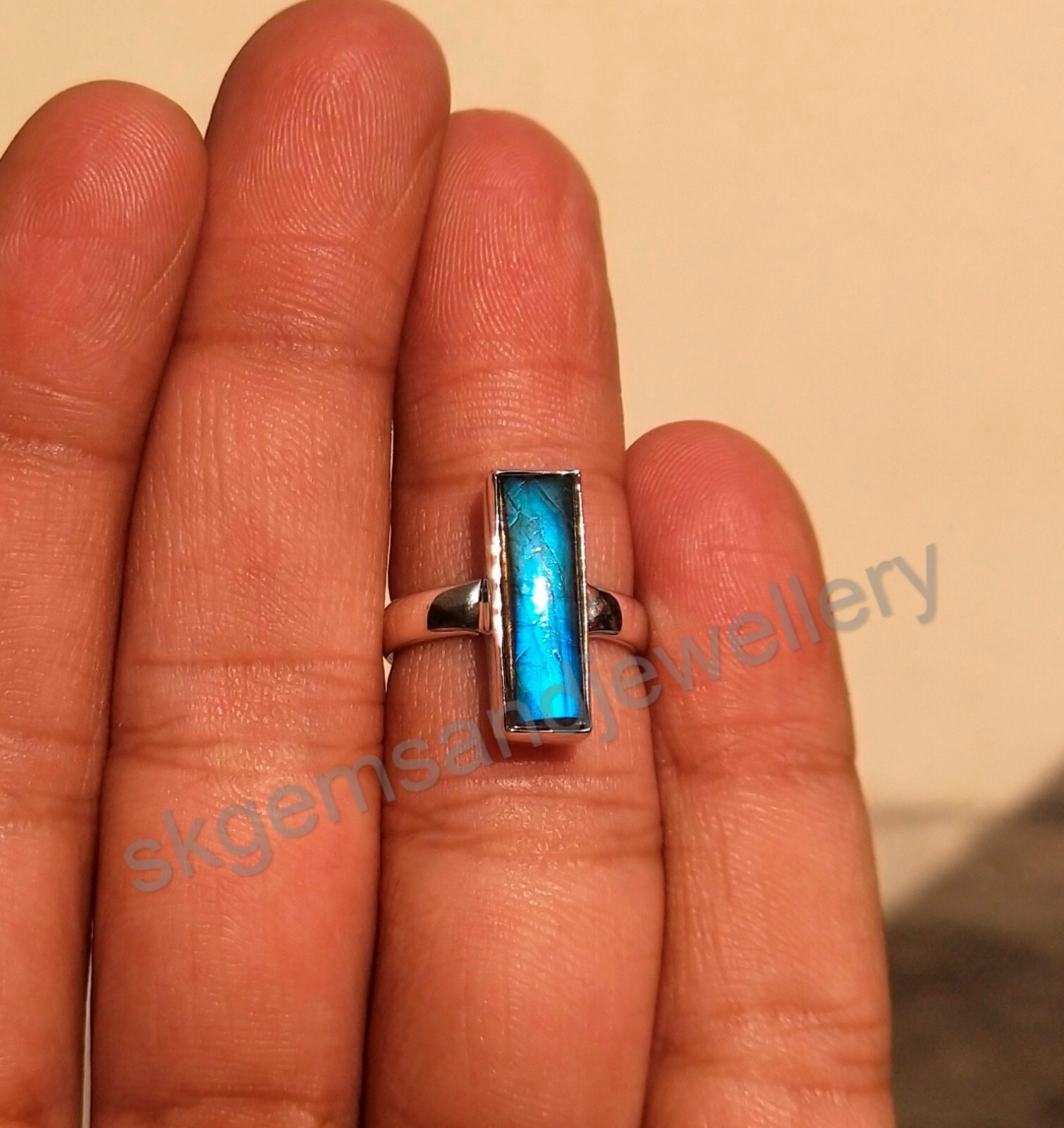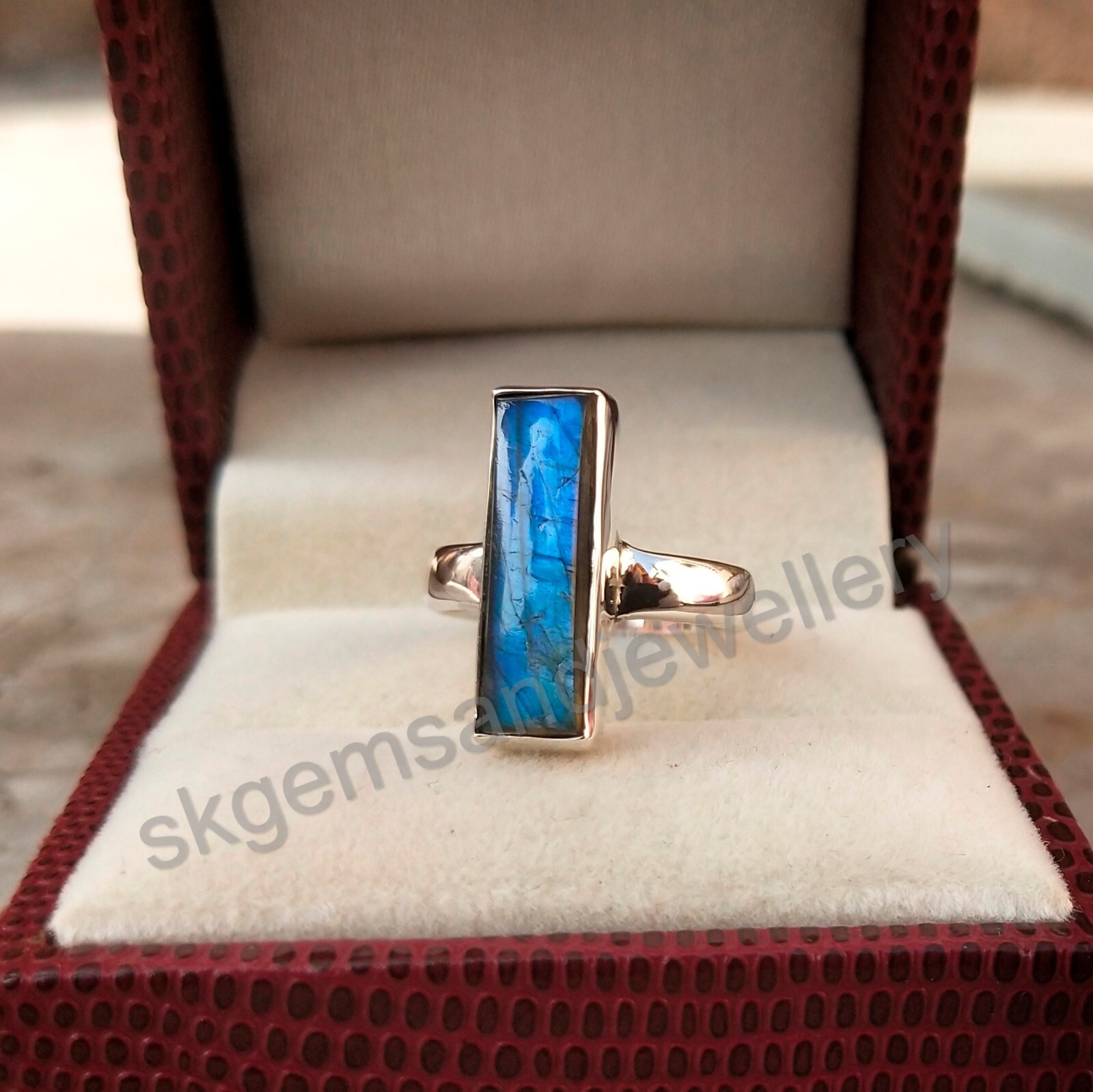 Natural Blue Labradorite Baguette Ring 925 Sterling Silver Handmade Ring For Her