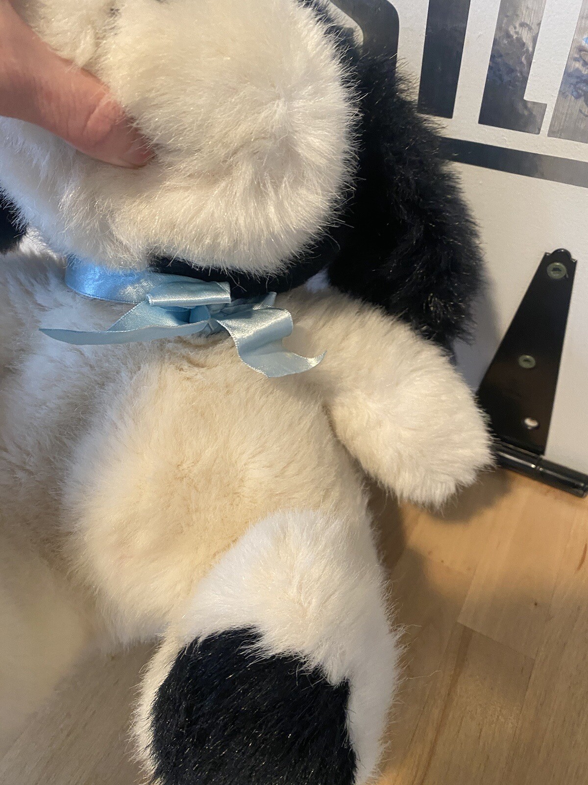 Dakin 1991 vintage plush puppy dog white Black Blue ribbon bow