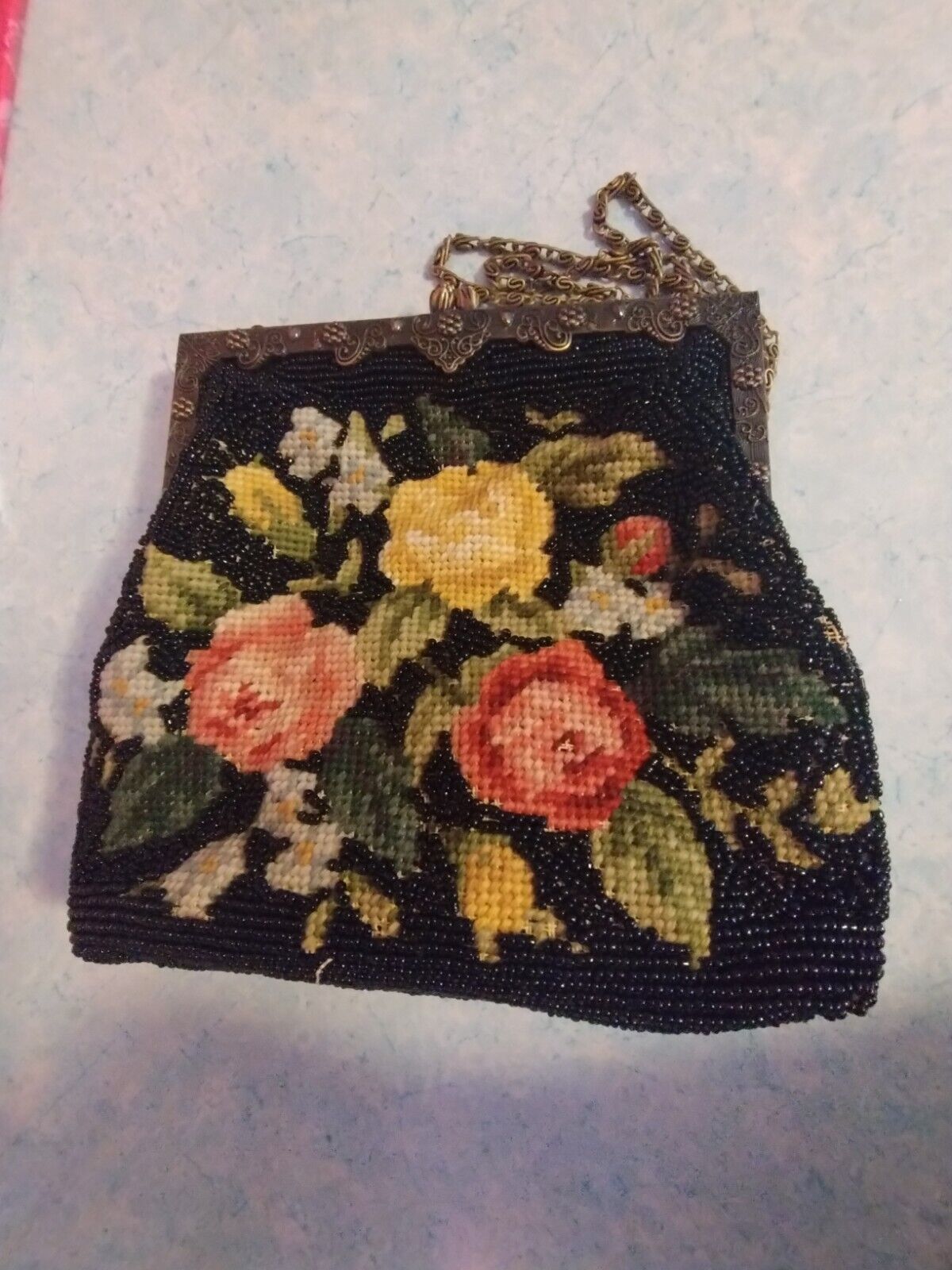 Vintage needlepoint tapestry purse handbag black with flowers