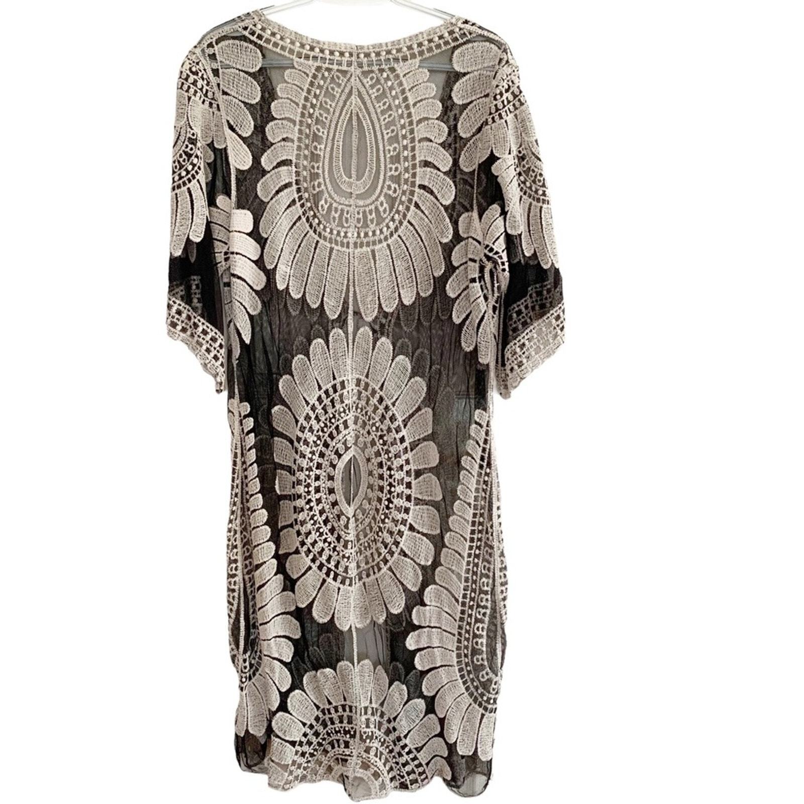 Cupshe Black Sand Embroidered Floral Medallion Long Swim Coverup Kimono OS