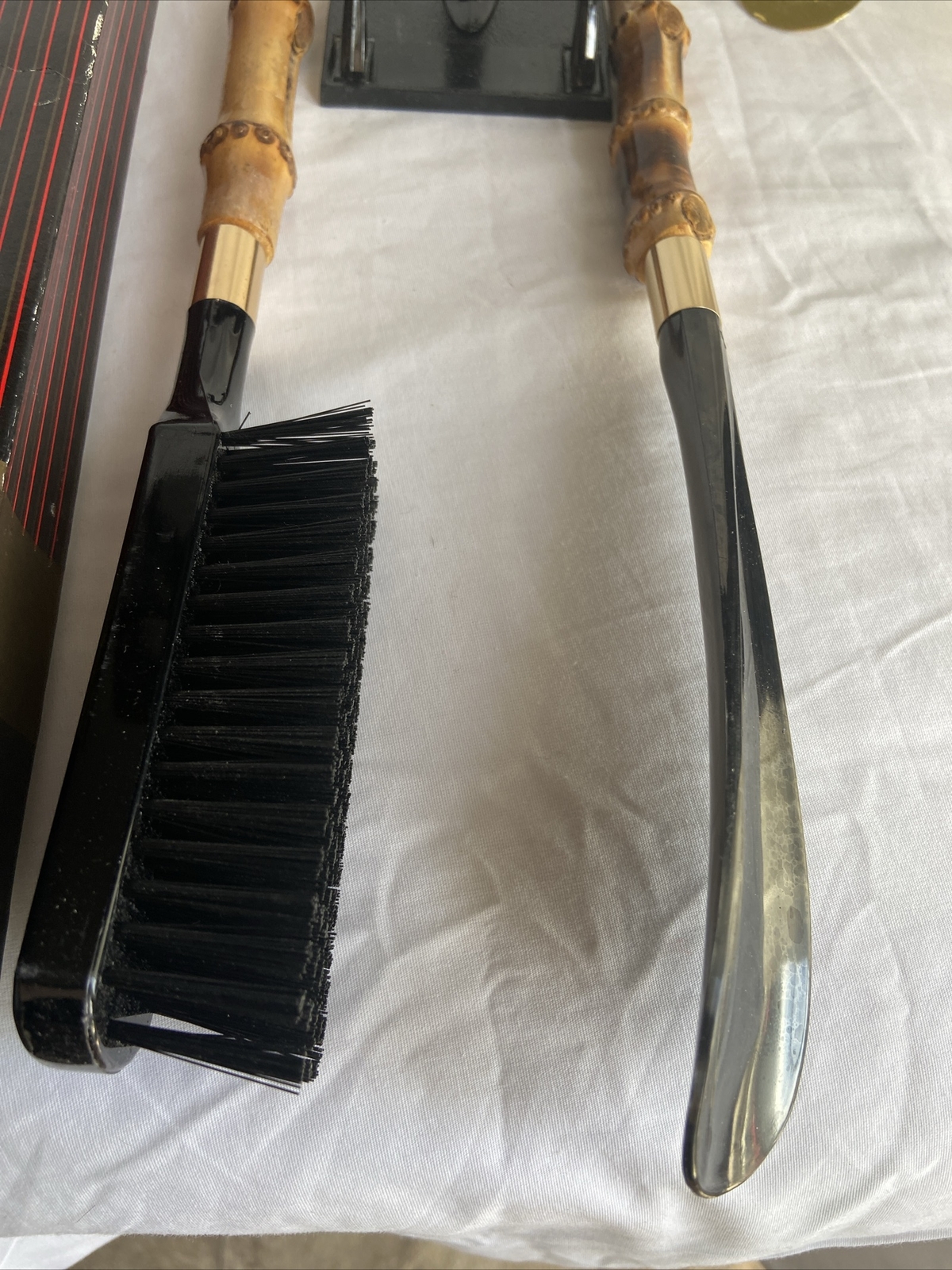 как выглядит Vintage Horse Head Bamboo Shoe Horn Lint Clothing Brush Set Equine фото