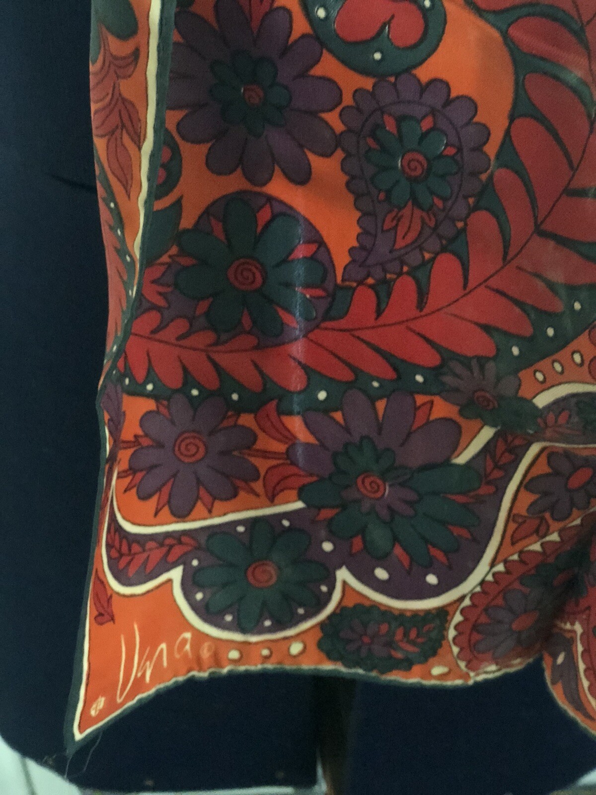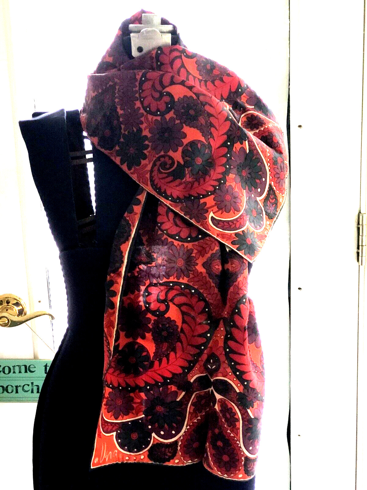 как выглядит VERA VINTAGE SCARF, ACETATE JAPAN 46 X 16" DARK DESIGN RED, ORANGE, GREEN фото