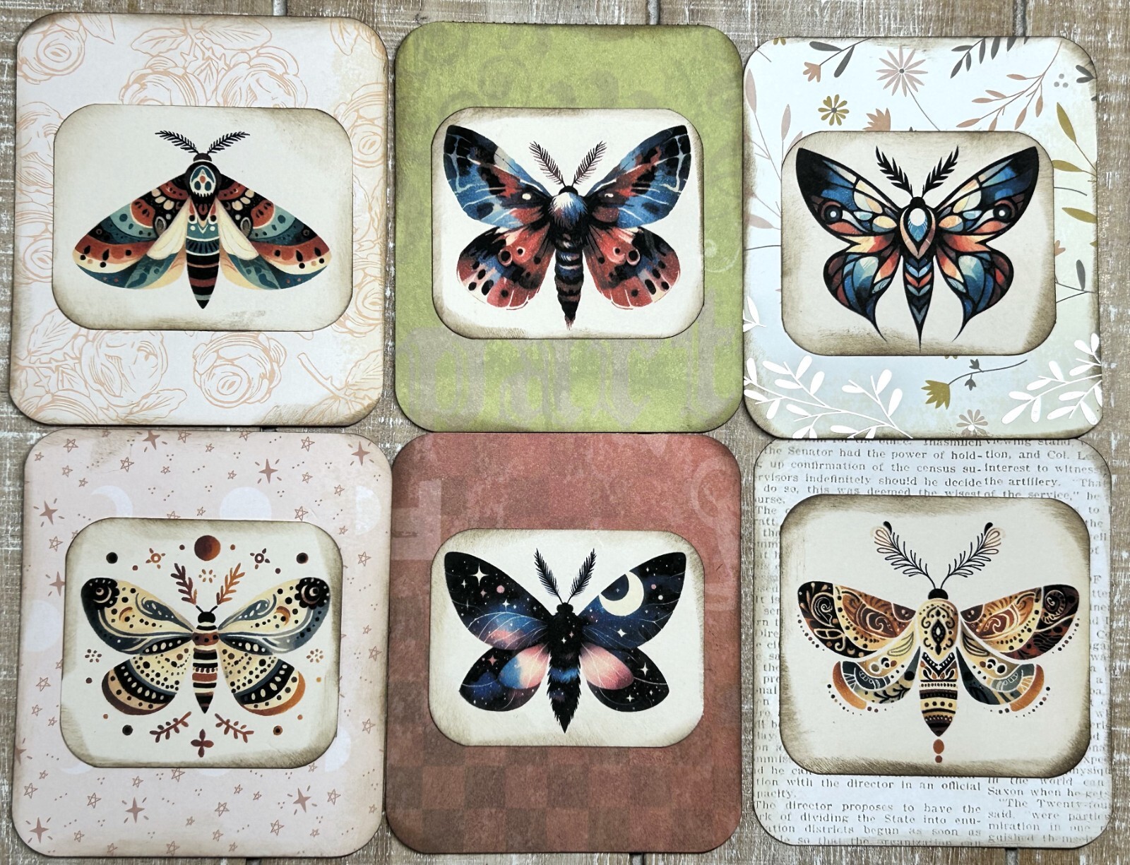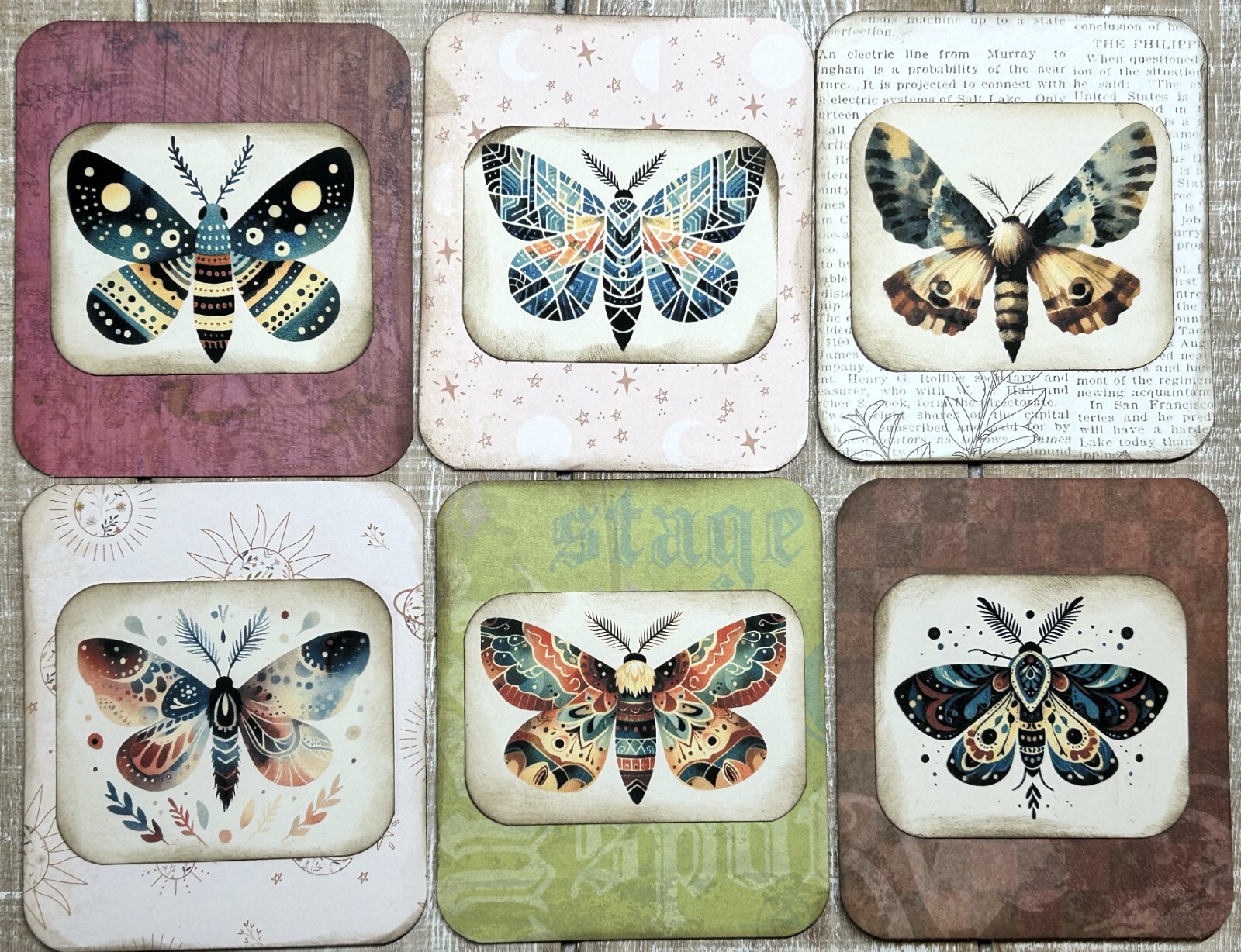 junk journal moth cards scrapbook card making set of 6 journal distressed card