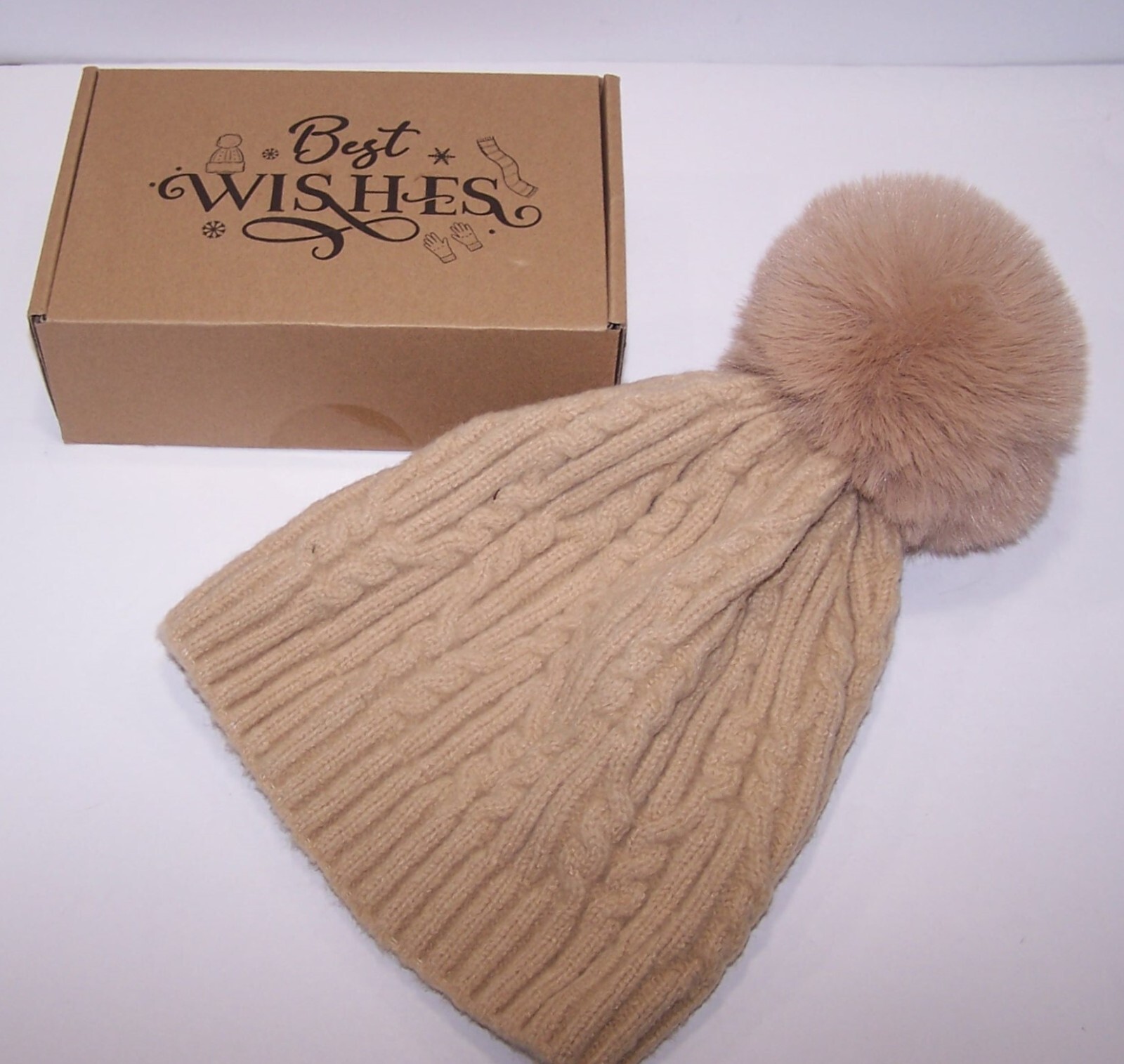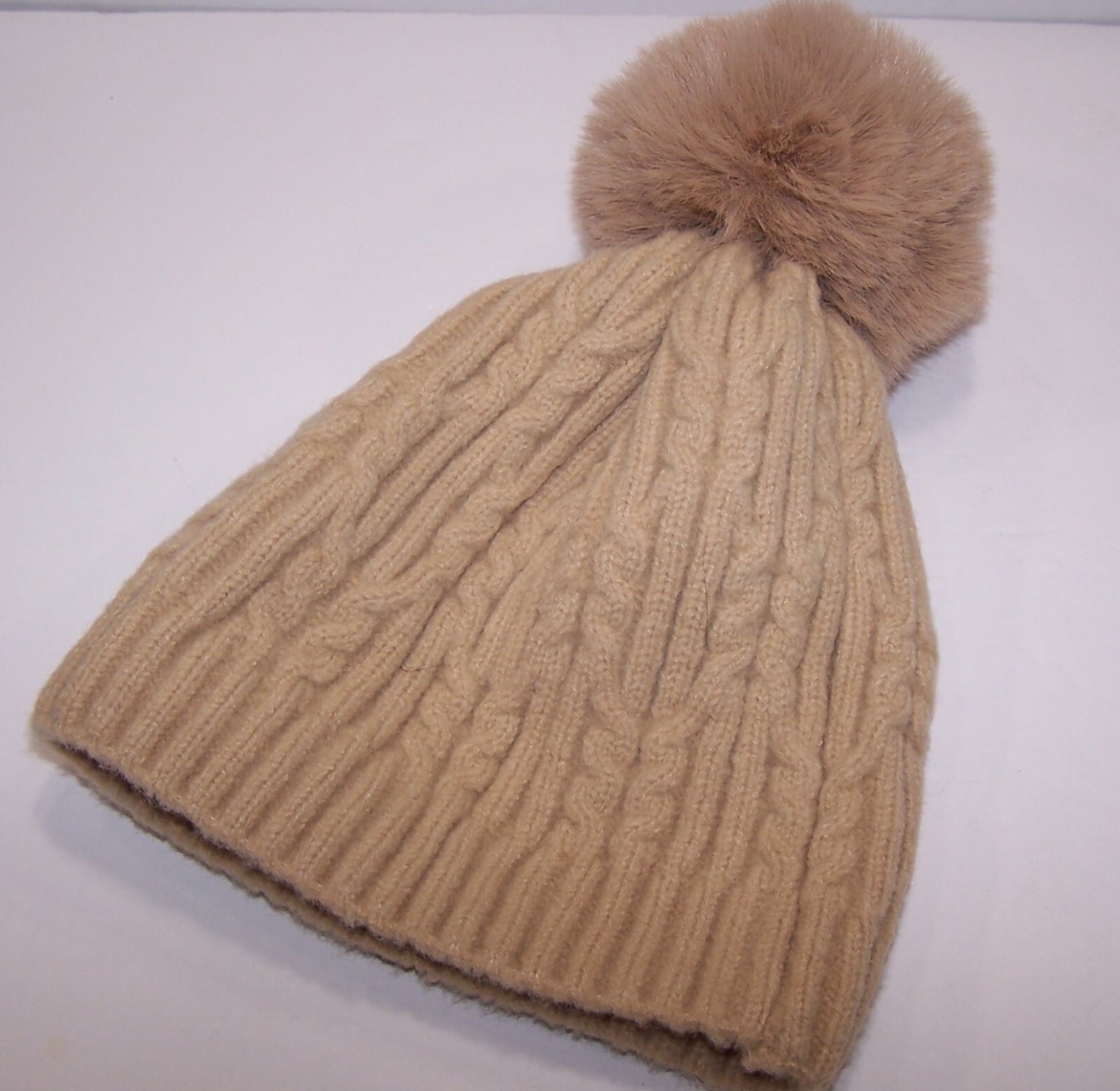 Warm Knit Beanie with Faux Fur Pom KHAKI Adult One Size