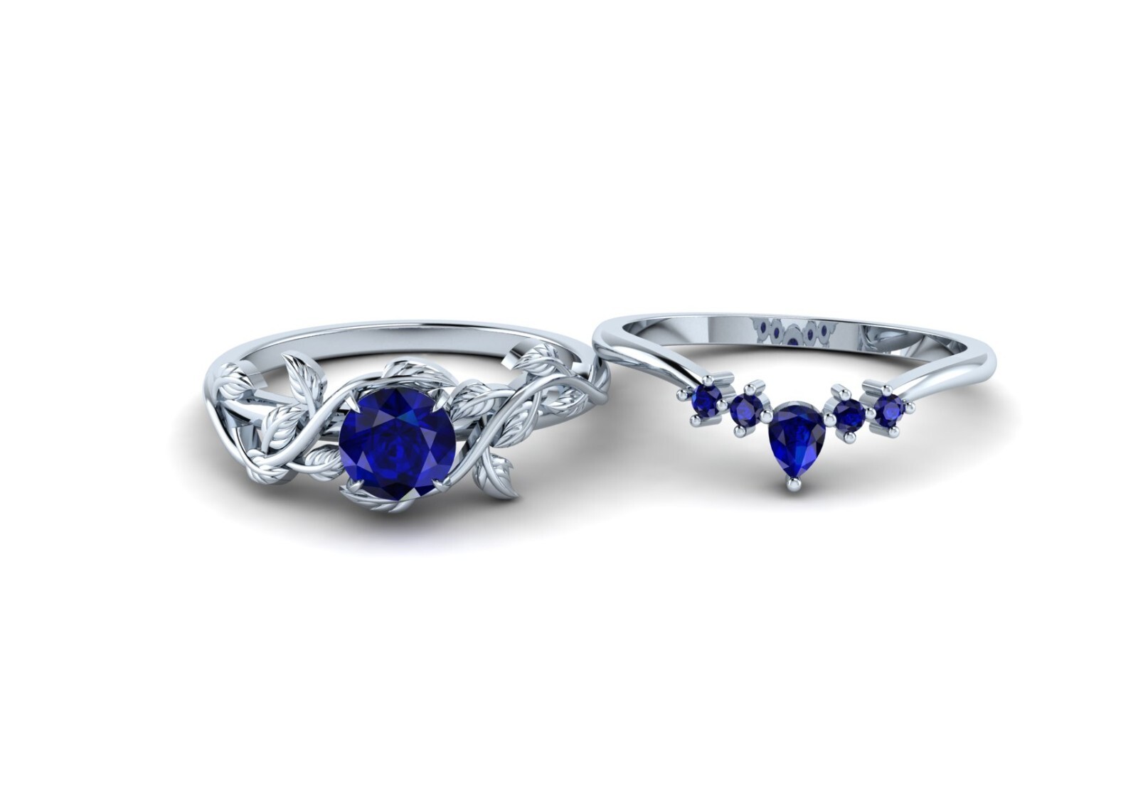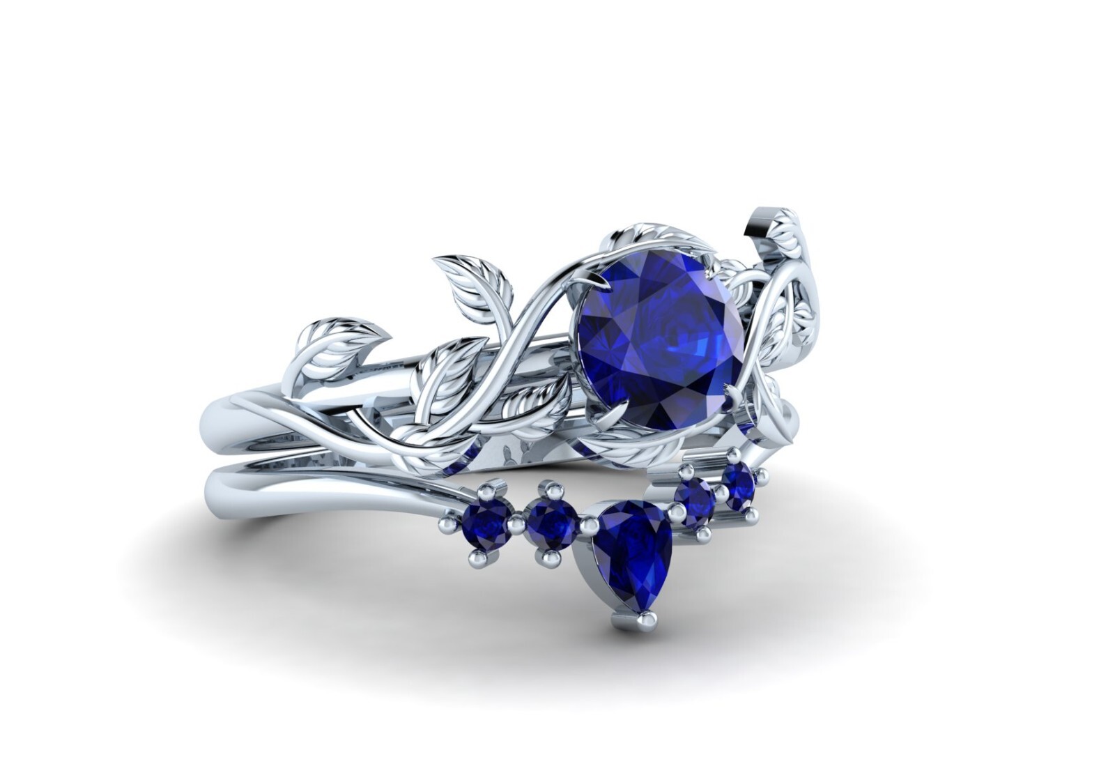 Leaf Round Cut Blue Sapphire Engagement Gifts 925 Platinum Vermeil Wedding Rings