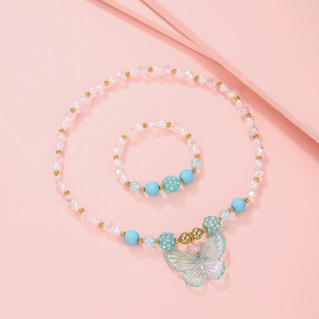 2Pcs/set Pink Butterfly Charm Necklace Bracelet Princess Girl Jewelry Set for Da