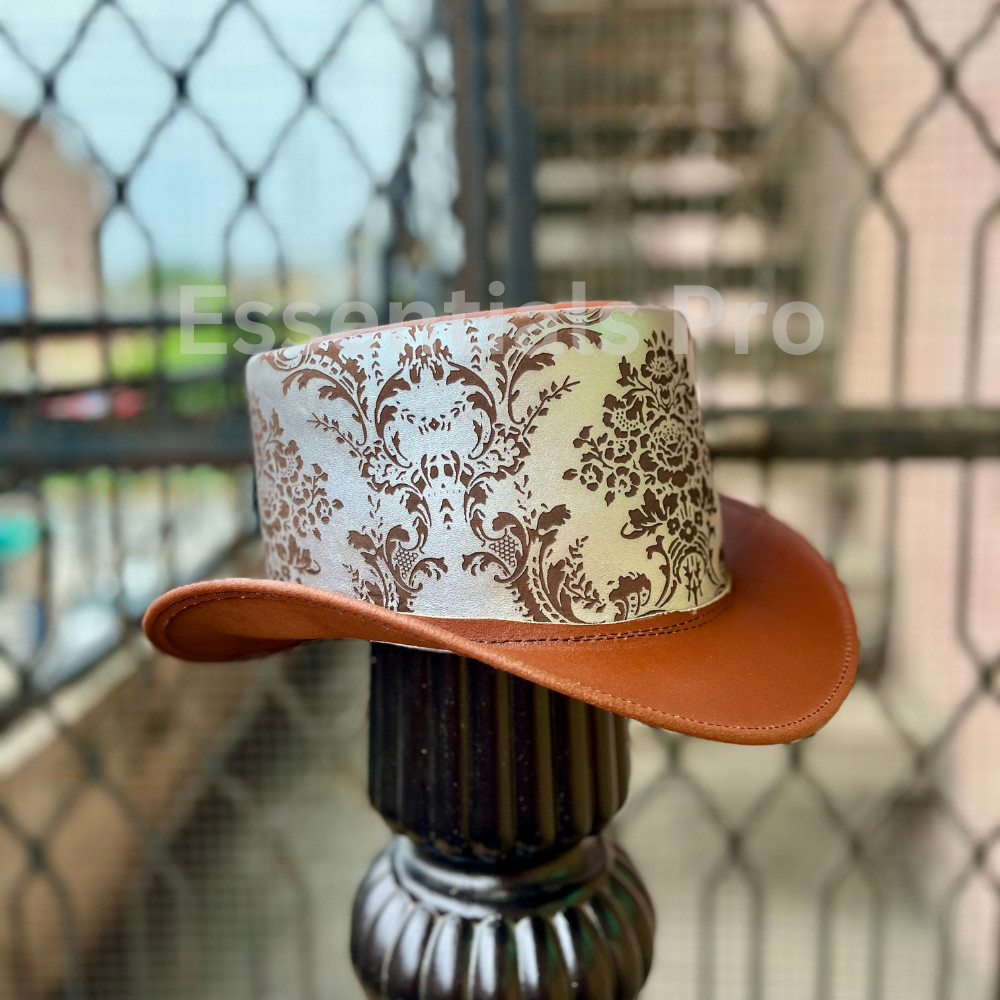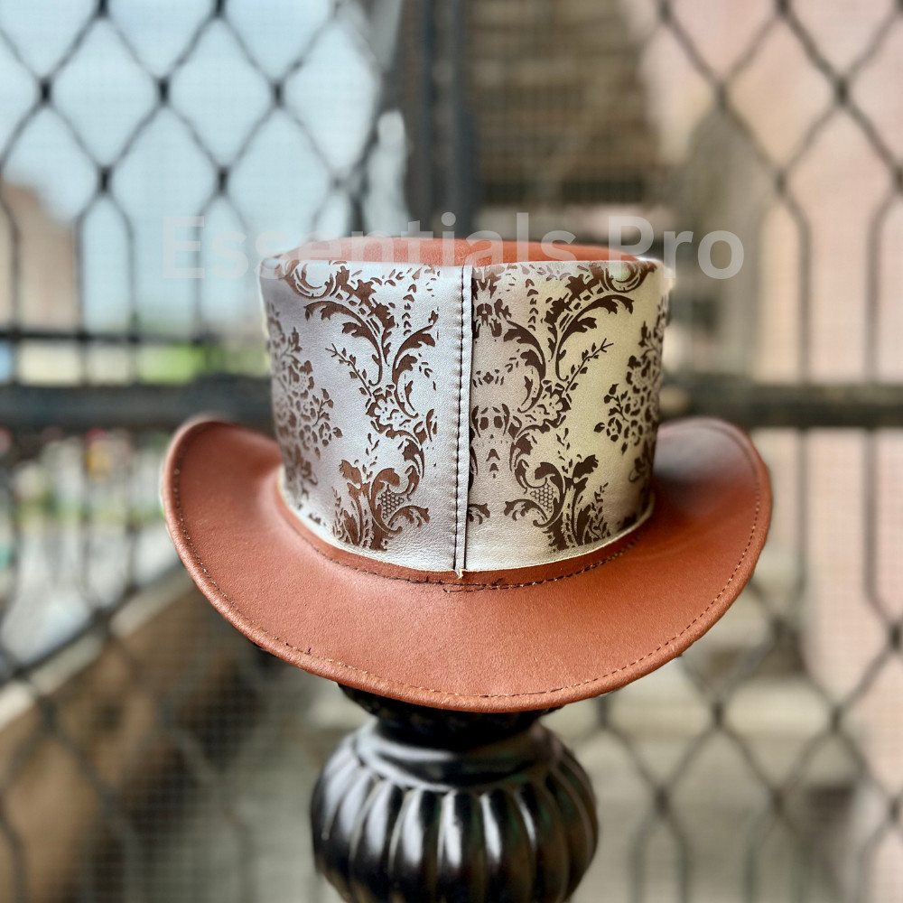 Brown Leather Top Hat with Damask Crown - Handmade Steampunk Fashion Hat For Her