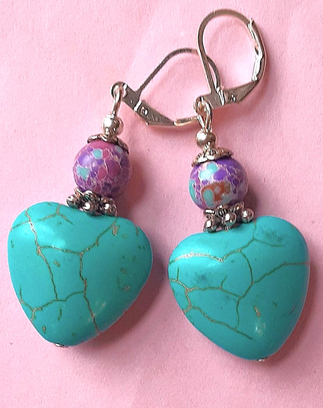 TURQUOISE HOWLITE HEART purple mosaic earring Silver Plate LEVERBACK artisan XX