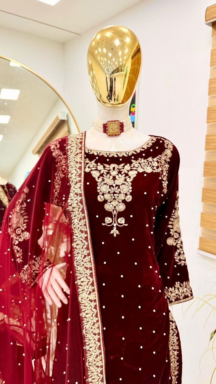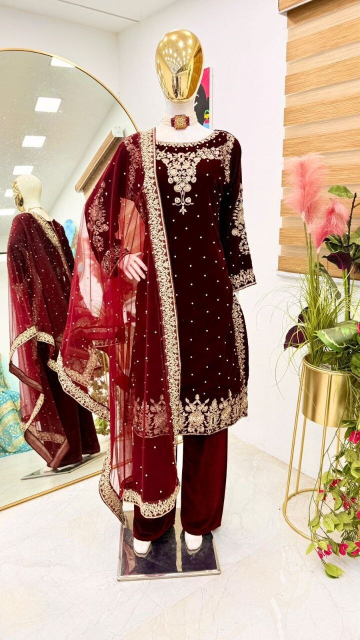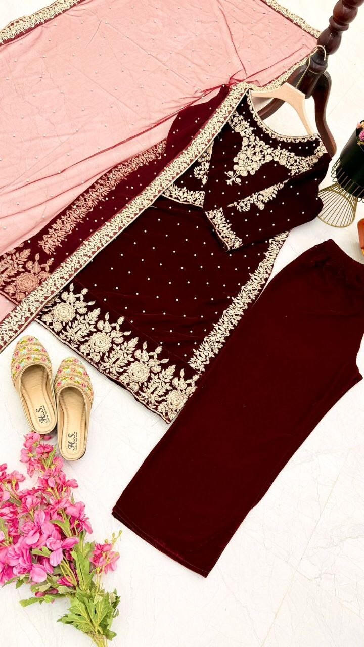 Maroon Velvet Kurti Pant Dupatta Wedding Ready Style Designer 3Pc Kurti Pant