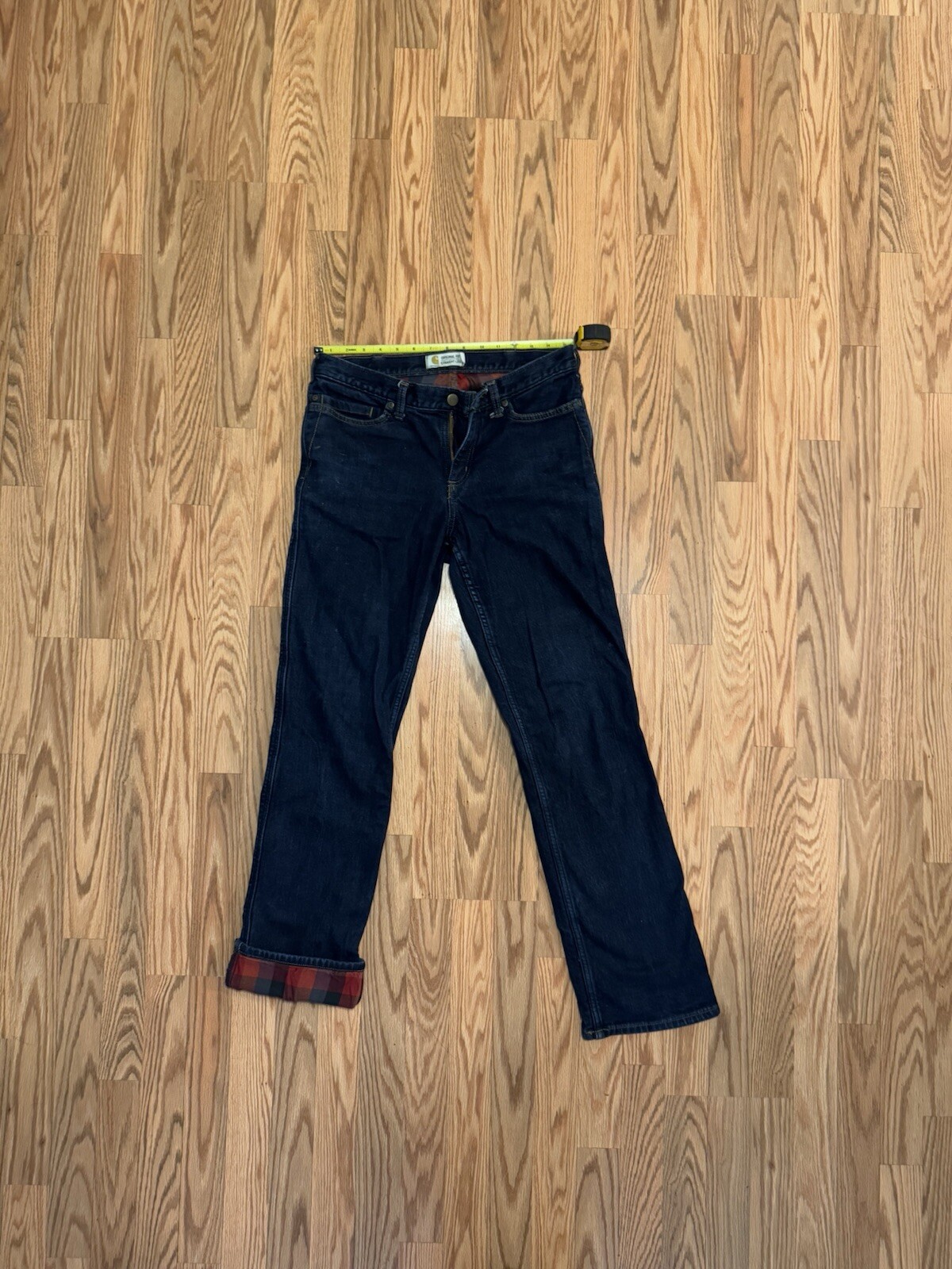 как выглядит CARHARTT Womens WB172 flannel lined denim jeans 8 relaxed fit straight leg фото
