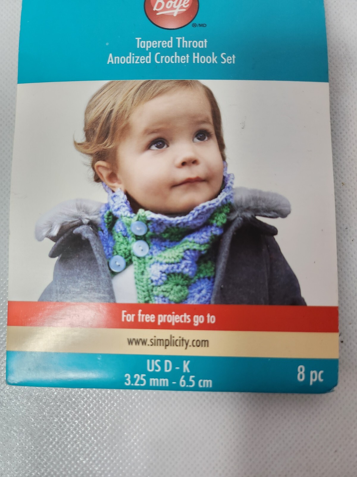 Boye Tapered Throat Anodized Aluminum Crochet Hook Set 8-Piece Size US D-K NEW