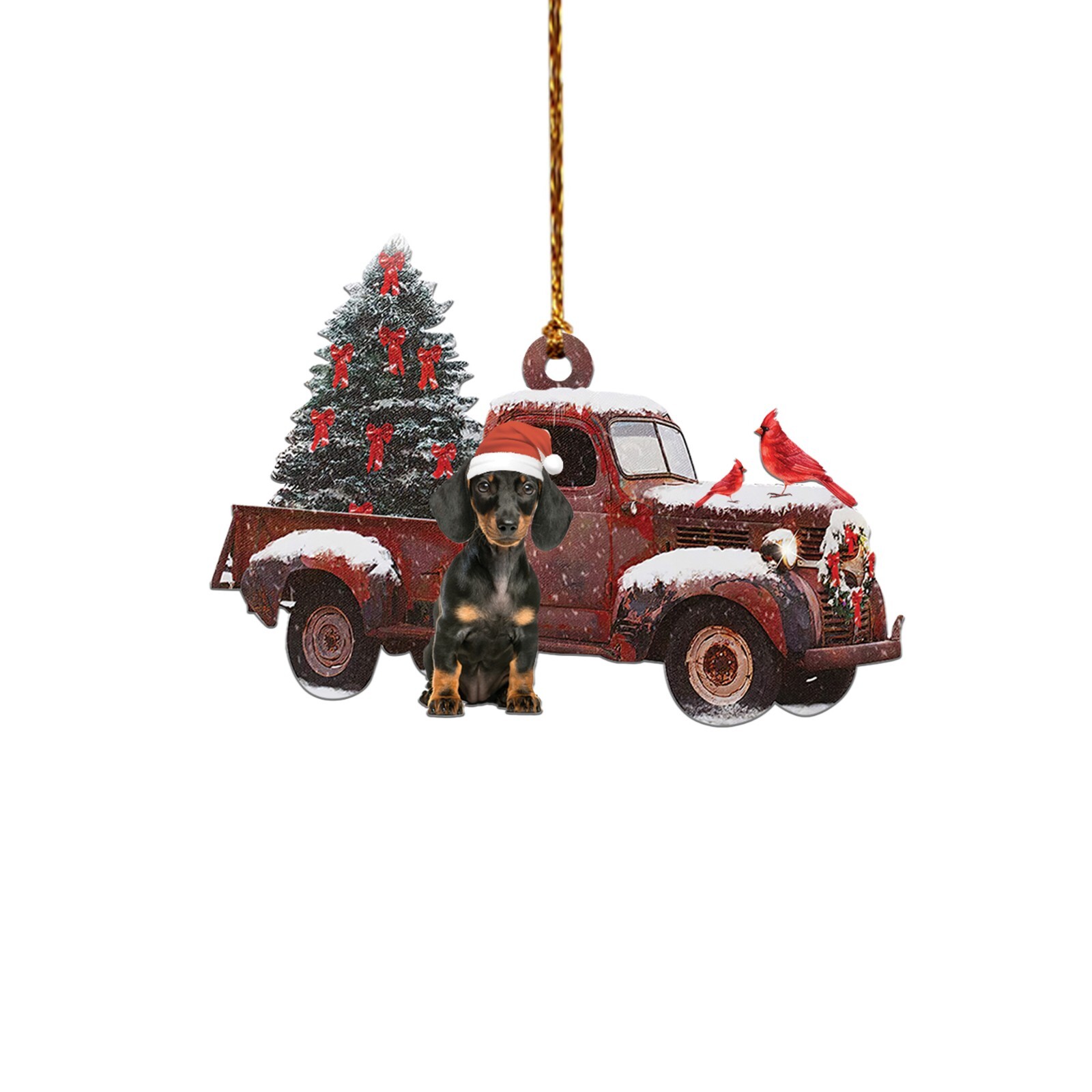 • Black and tan dachshund dog Ornament, Dog in red truck tree Christmas Ornament