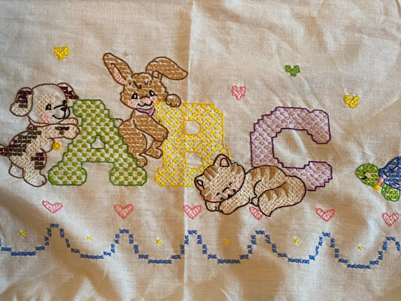 Vintage Hand Embroidery Cross Stitch White Crib Sheet. ABC's 33x44 Dog Cat