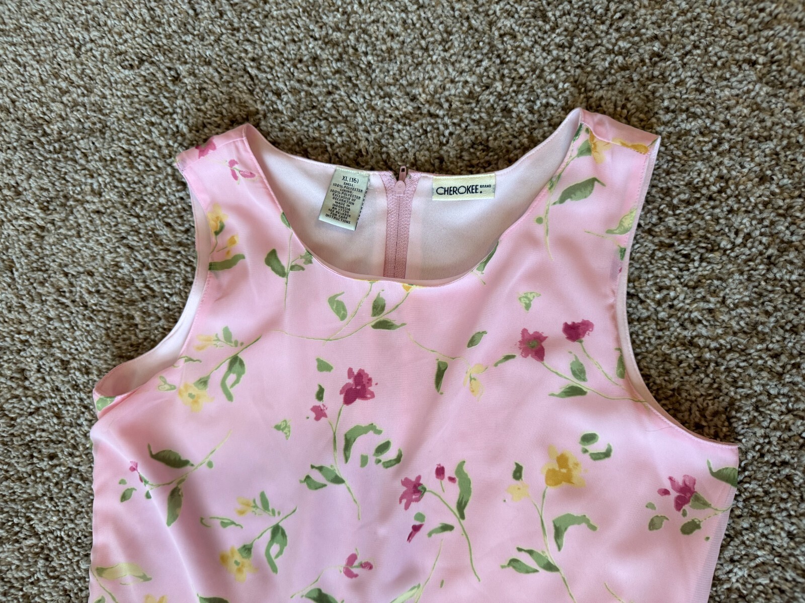 Y2K Vintage 90s Girl's Pink Floral Midi Length Dress XL/16 Lace Lining Cherokee