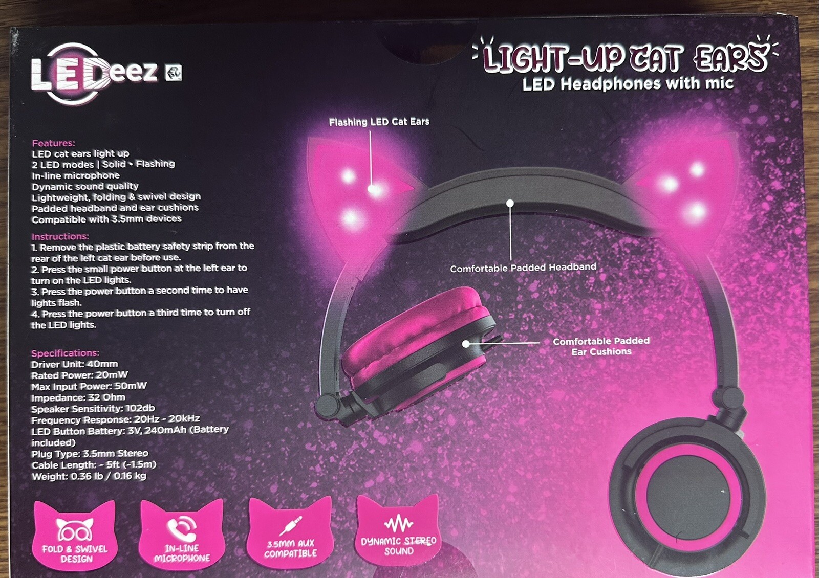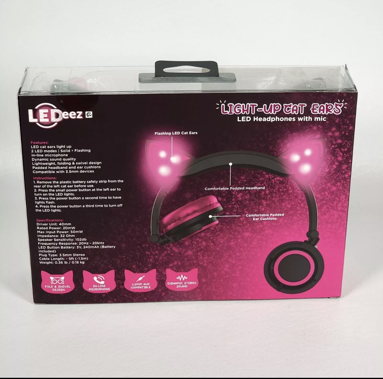 LeDeez Light-Up Cat Ears LED Headphones with Mic AUX Compatible Pink Brand New