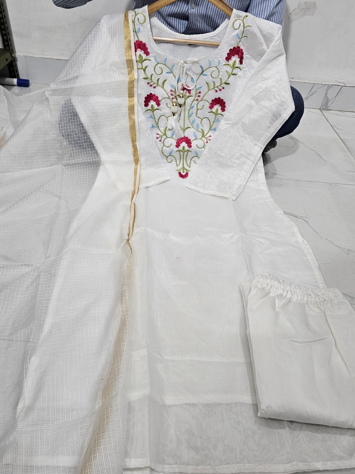 как выглядит Chanderi Kurti pant with dupatta set with hand work printed фото