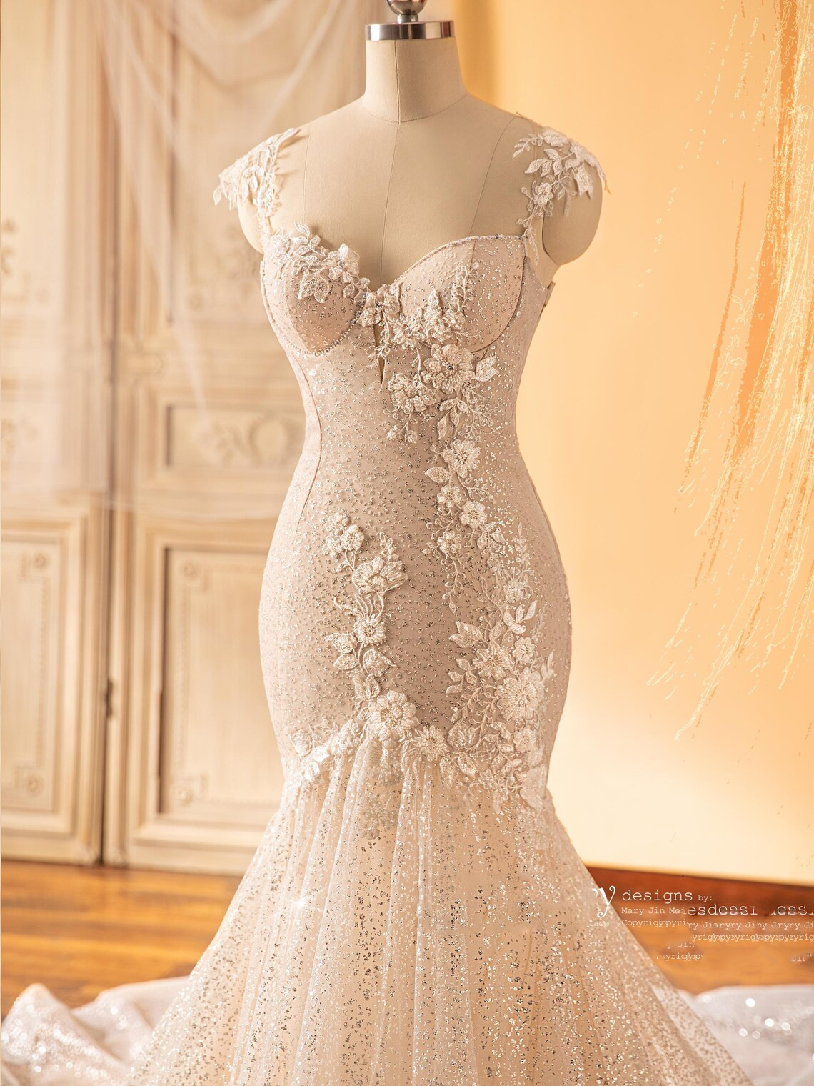 Exquisite Mermaid Wedding Dress with Colored Underlay and Ivory Flower Appliques
