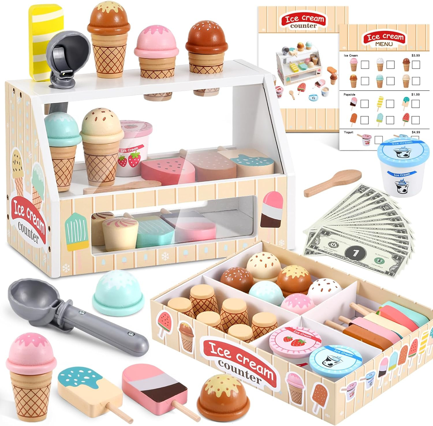 Wooden Ice Cream Counter Playset for Toddler Girl Toys, Play Store Pretend To...